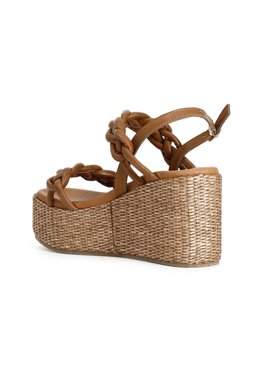 Sandali modello frate con tomaia intrecciata. zeppa fasciata in rafia.