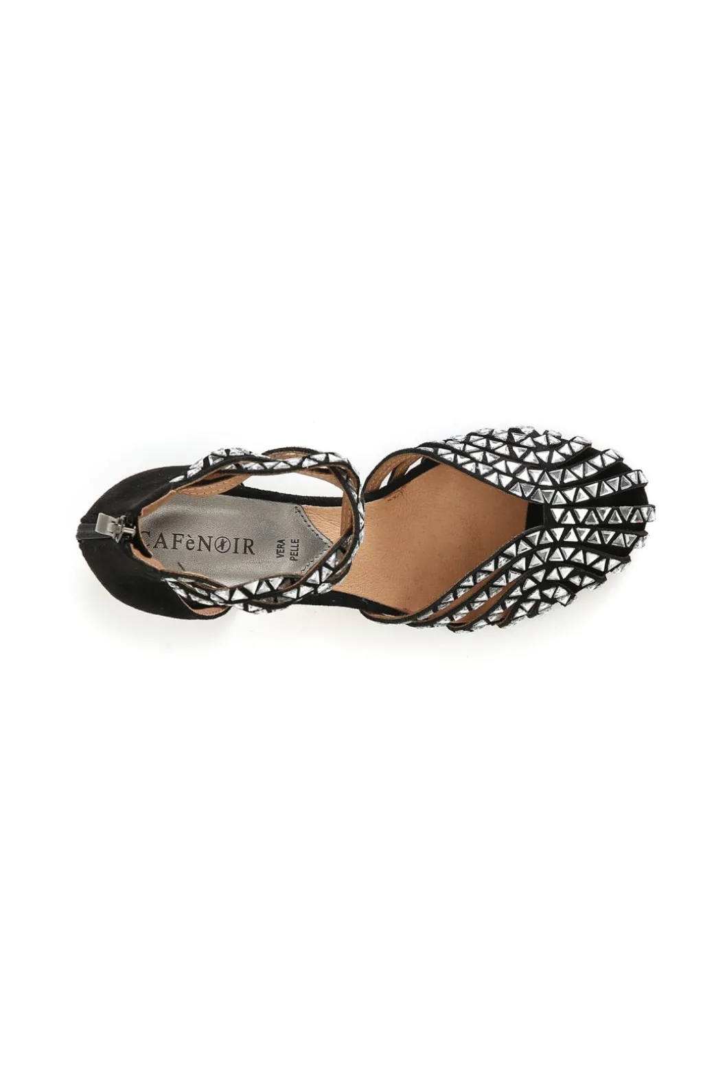 Sandali a gabbia con cerniera sul toppone arricchiti da una treccia di strass triangolari alla caviglia. tacco alto 60mm.