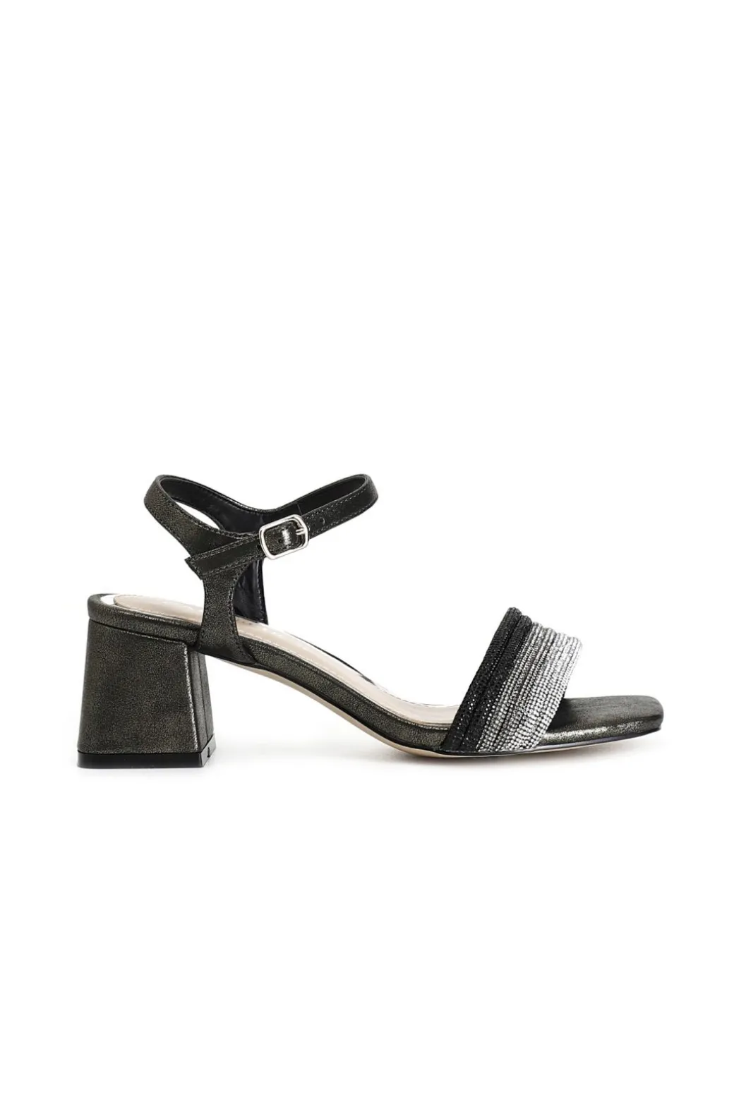 Sandali modello gilda effetto laminato con fasce sul davanti in strass. il soletto imbottito in vera pelle fa risultare la calzatura comoda anche dopo svariate ore di utilizzo. il tacco è di 50mm.