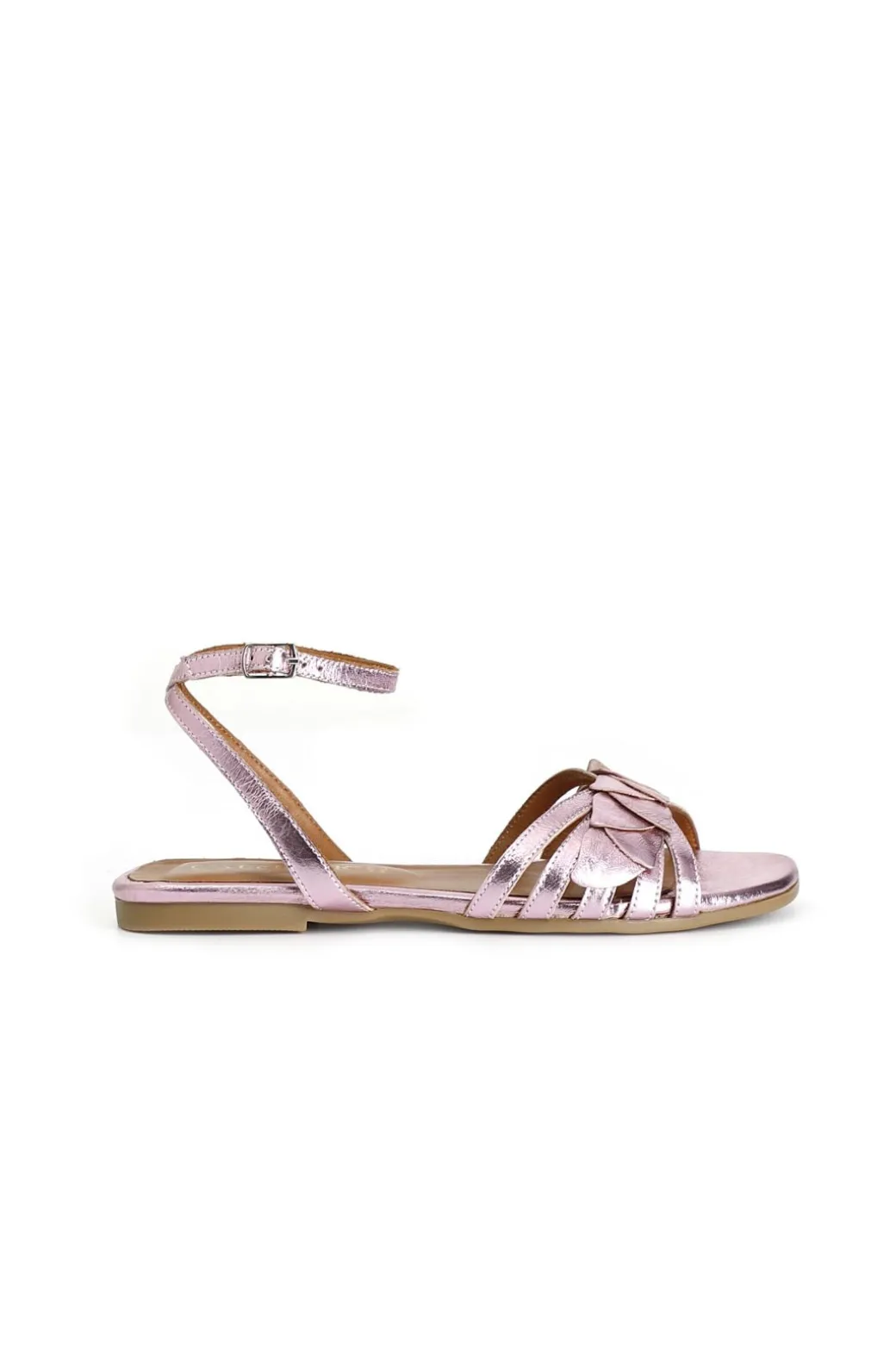 Sandali bassi in pelle laminata con laccio alla caviglia e decoro frontale simile ad un intreccio di foglie.