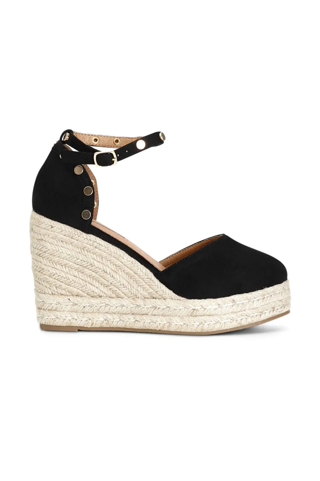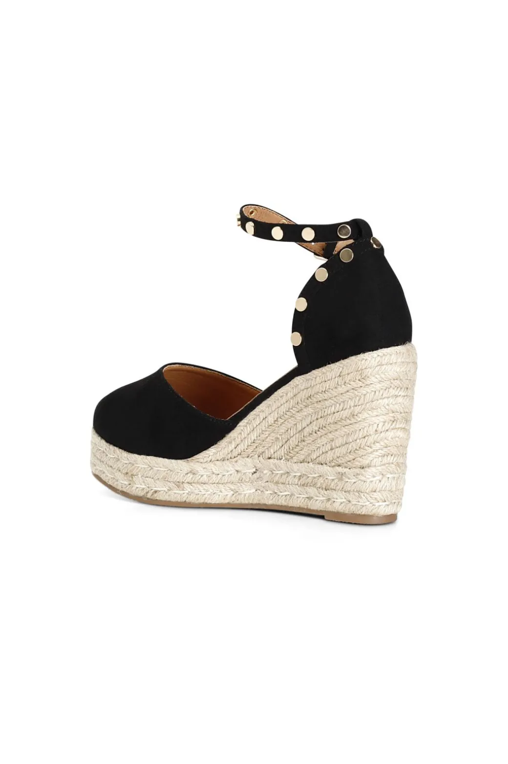 Sandali su zeppa in corda con cinturino alla caviglia in tessuto chiuso davanti e dietro con borchie dorate.