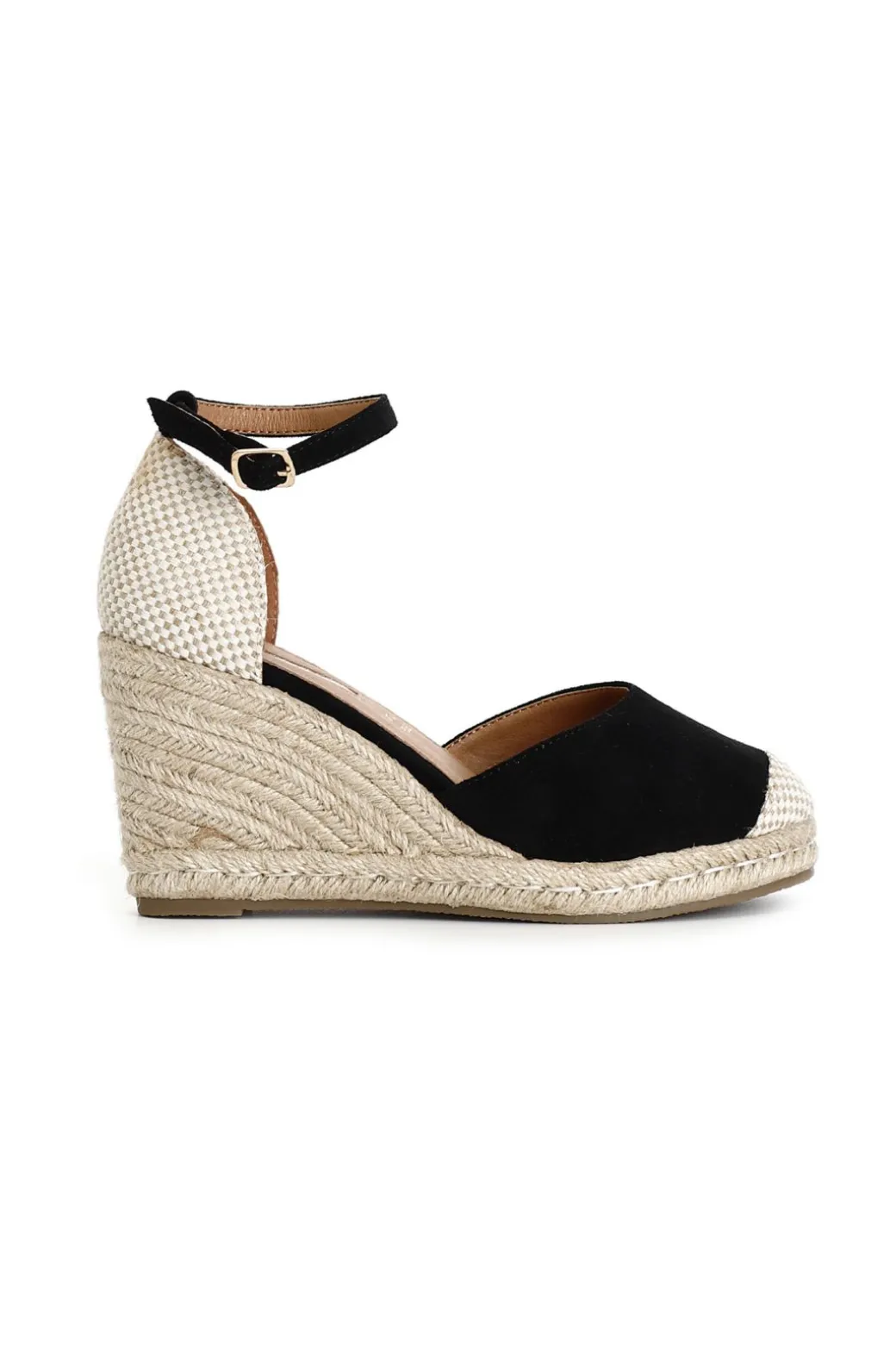 Sandali in tessuto su zeppa in corda. cinturino alla caviglia in tessuto. calzatura chiusa davanti e dietro.