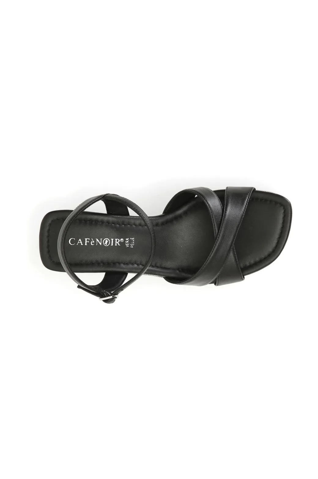 Sandali con tomaia ad incrocio in nappa e cinturino alla caviglia. zeppa caratterizzata da fasce di strass. il comodo soletto imbottito in vera pelle fa risultare la calzatura comoda anche dopo svariate ore di utilizzo. il tacco è alto 70mm il plateau invece è di 35mm.
