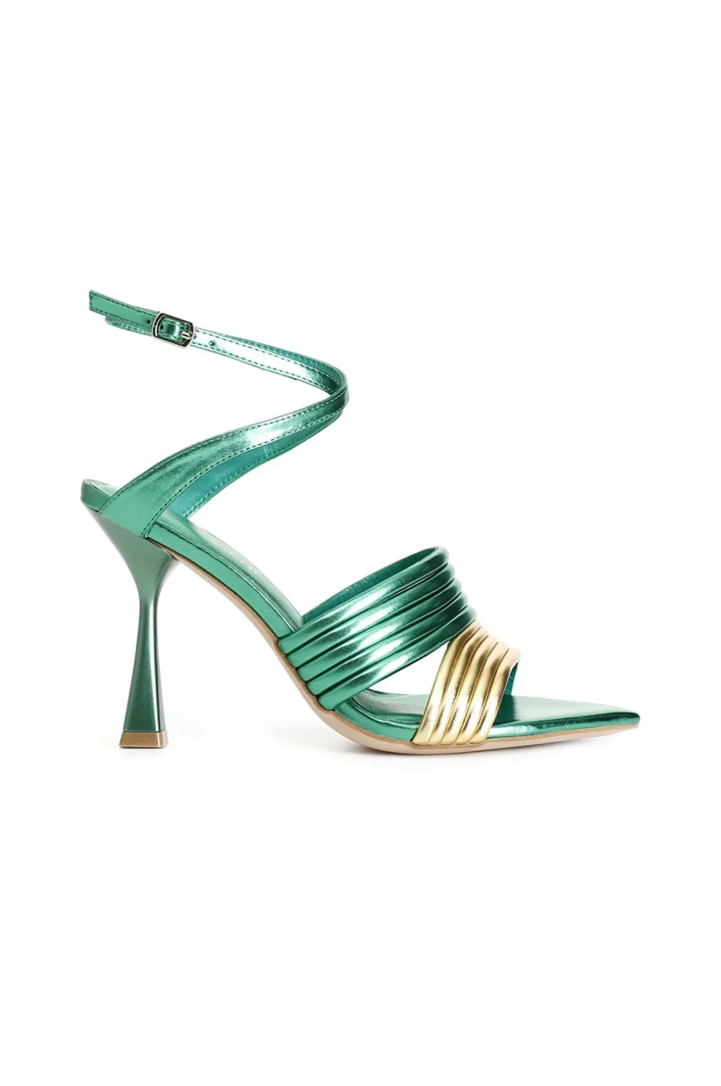Sandali bicolor effetto laminato con listini imbottiti e incrocio alla caviglia con fibbia. dalla forma sfilata questa calzatura ti regalerà un tocco di eleganza e glamour. tacco a rocchetto alto 90mm.