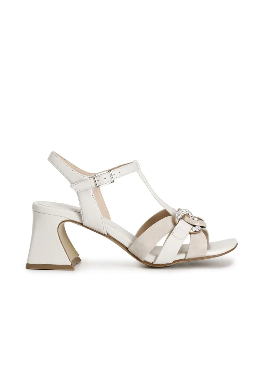 Sandali modello a “t” in camoscio e nappa con accessorio catena. calzatura che può essere indossata tutto il giorno grazie al tacco a base larga alto 55mm e alla comoda base d’appoggio.