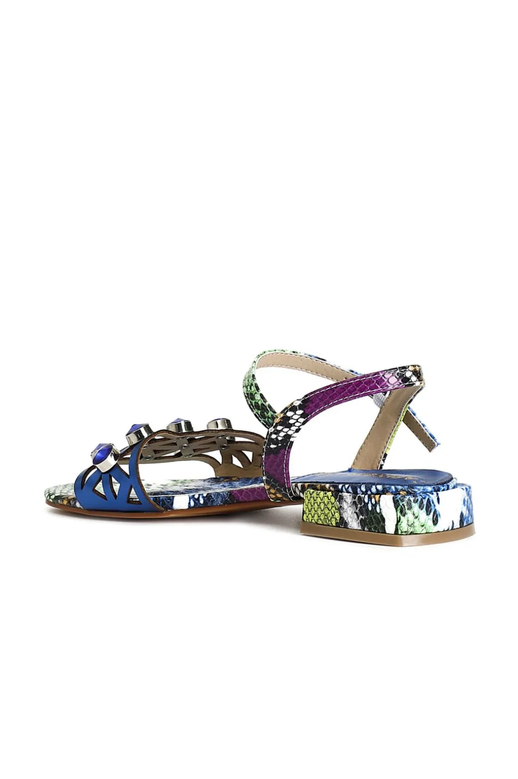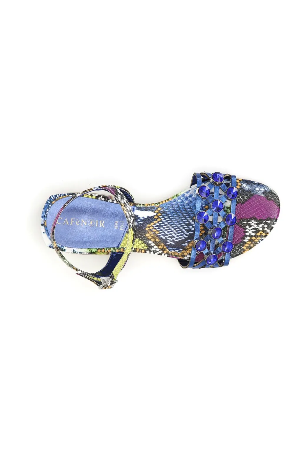 Sandali fustellati con strass colorati effetto lizard. comodo soletto imbottito per una calzata morbida. tacco alto 20mm. comodi da indossare e facili da abbinare.