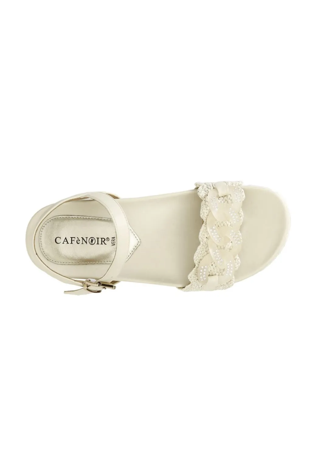 Sandali color block in raffia intrecciata con accessorio catena trasparente satinata. comodo footbed e la zeppa è fasciata in raffia.