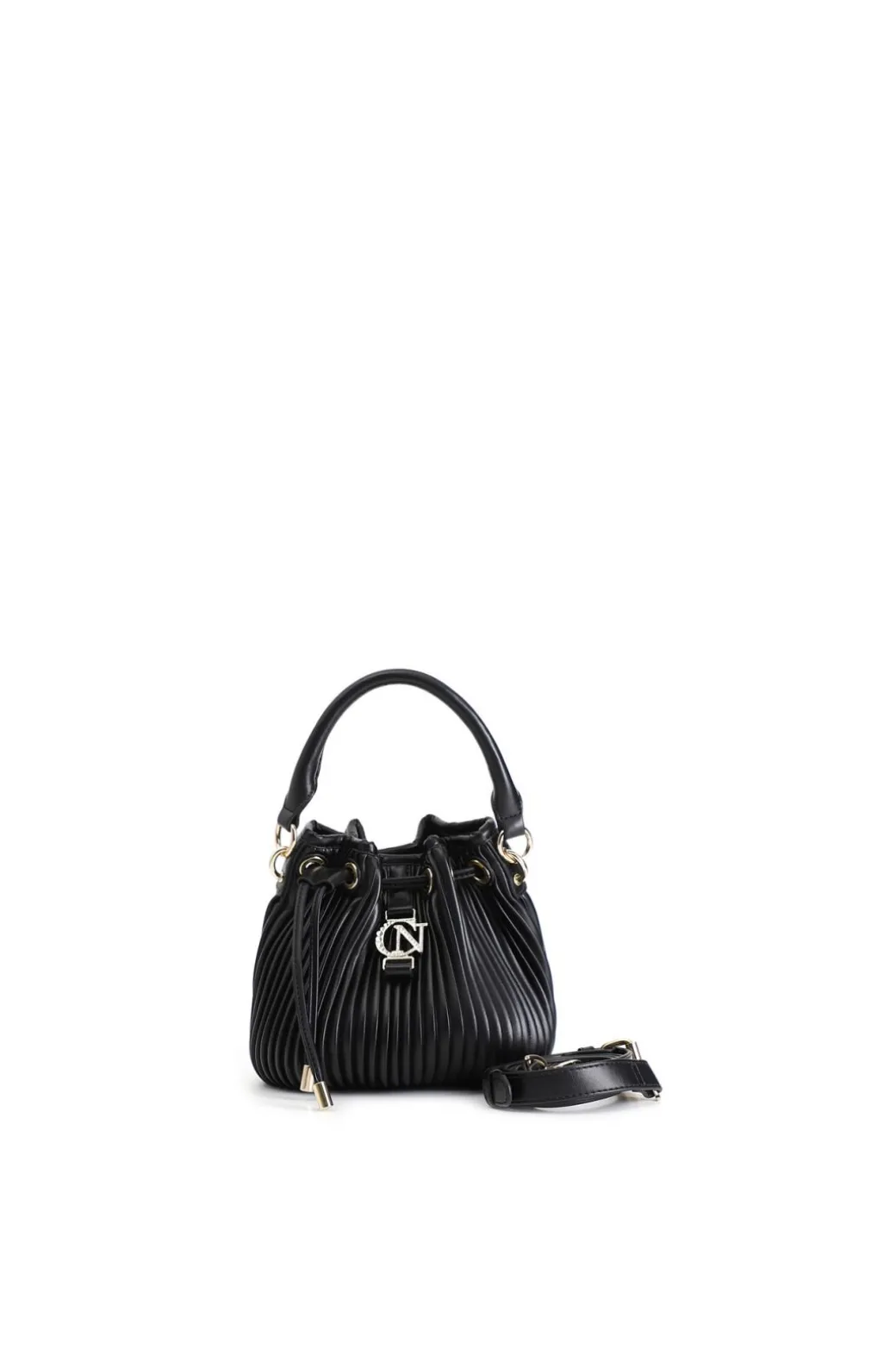 Secchiello con coulisse in materiale metallizzato plissè con dettaglio logo in metallo con strass. tracolla removibile.