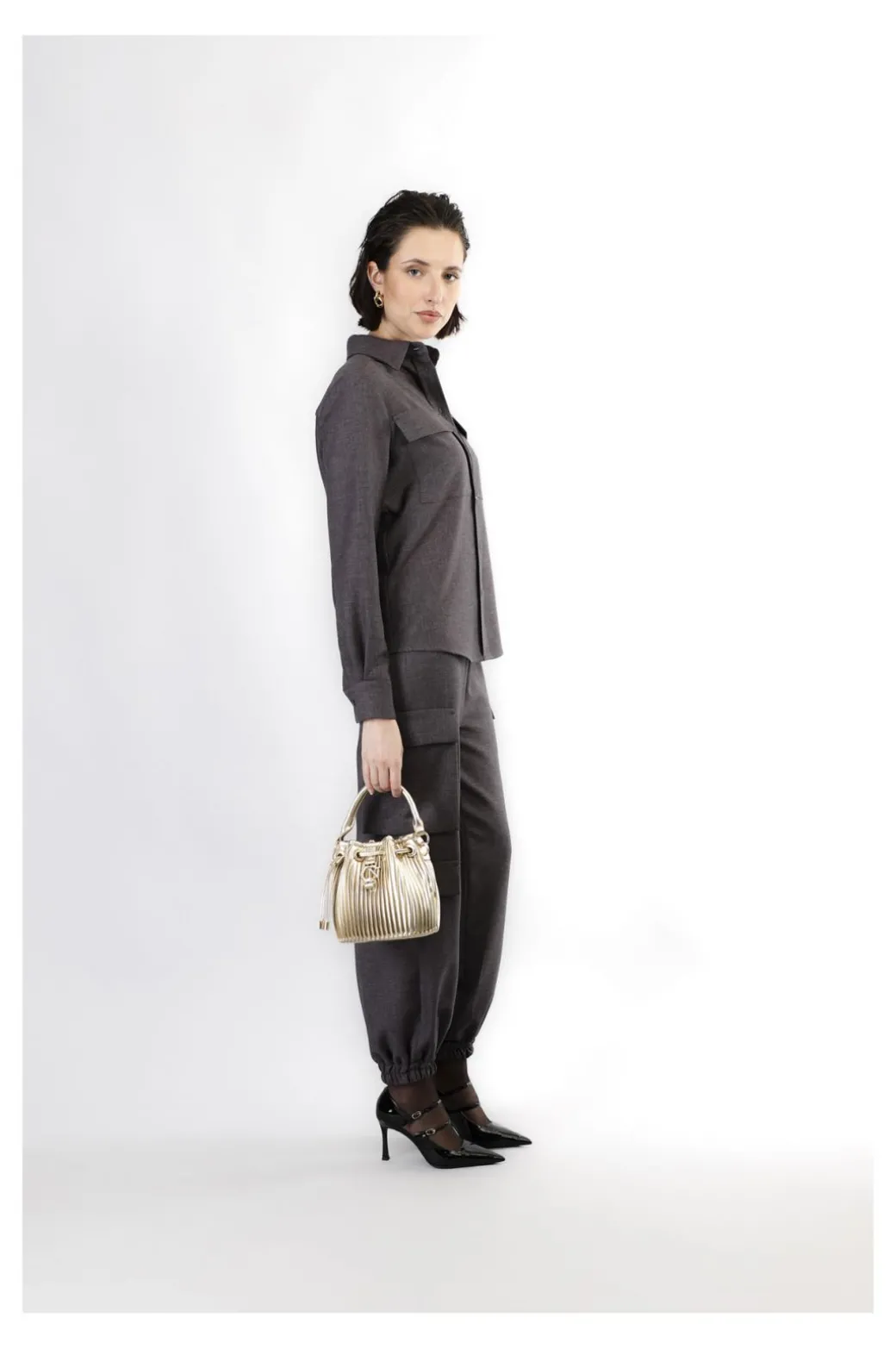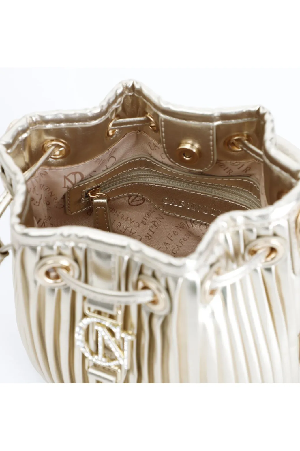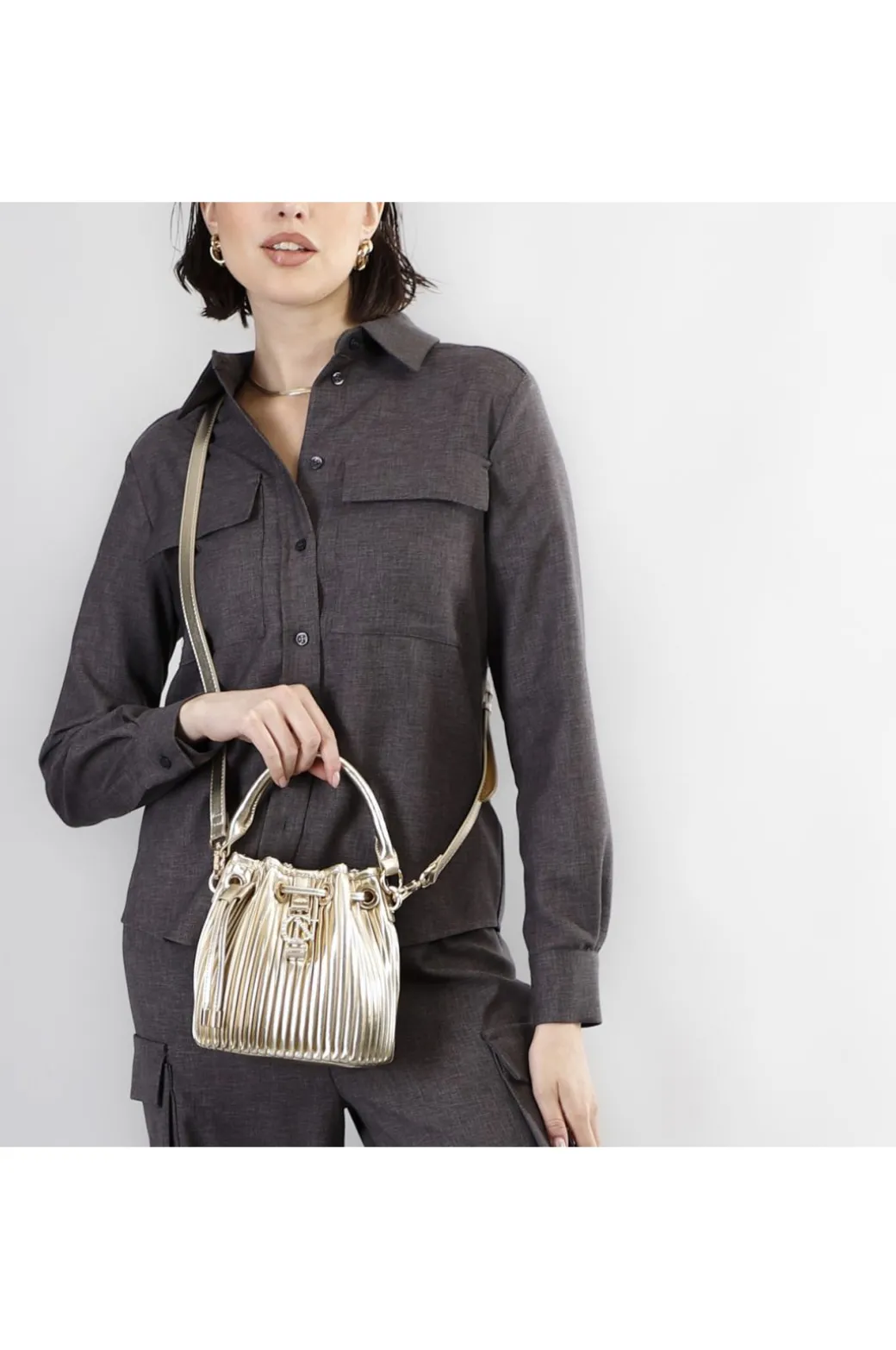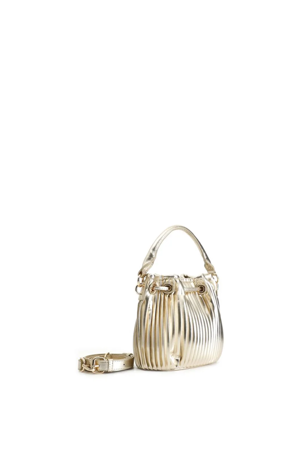 Secchiello con coulisse in materiale metallizzato plissè con dettaglio logo in metallo con strass. tracolla removibile.