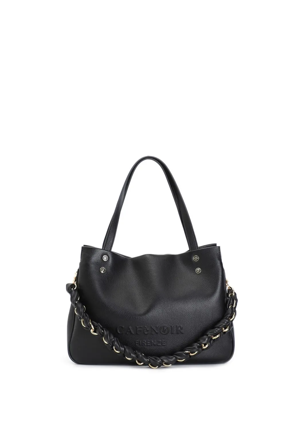 Shopping con logo cafènoir firenze in rilievo con manici lunghi e tracolla in catena intrecciata. chiusura con cerniera.