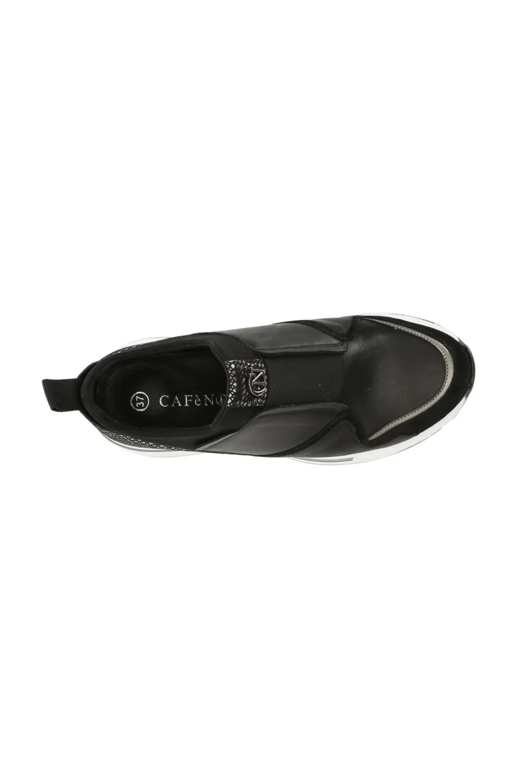 Silp-on in pelle arricchita da inserti laminati e fascia elastica che agevola la calzata. suola rialzata bicolor con logo embossed.