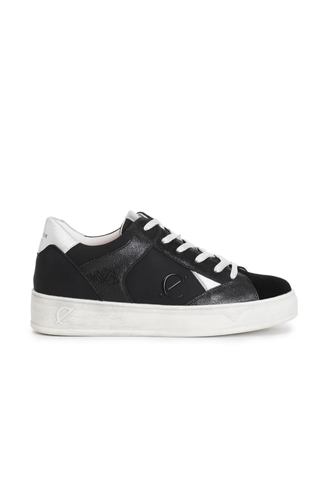 Sneakers da donna in pelle e pelle scamosciata con riporti effetto vernice e metallico. logo embossed laterale con monoframma cafènoir. calzatura dalla forma stondata. chiusura con lacci. fussbett interno. suola a cassetta 30mm.