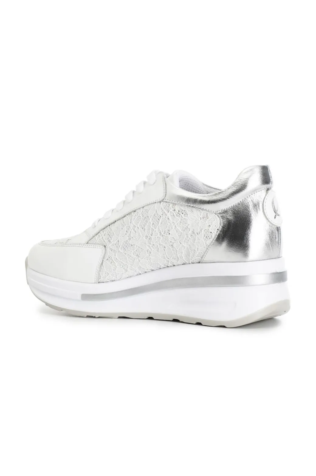 Sneakers in pelle caratterizzata da eleganti riporti effetto pizzo e laminato. suola con zeppa bicolor di 40mm con logo embossed.