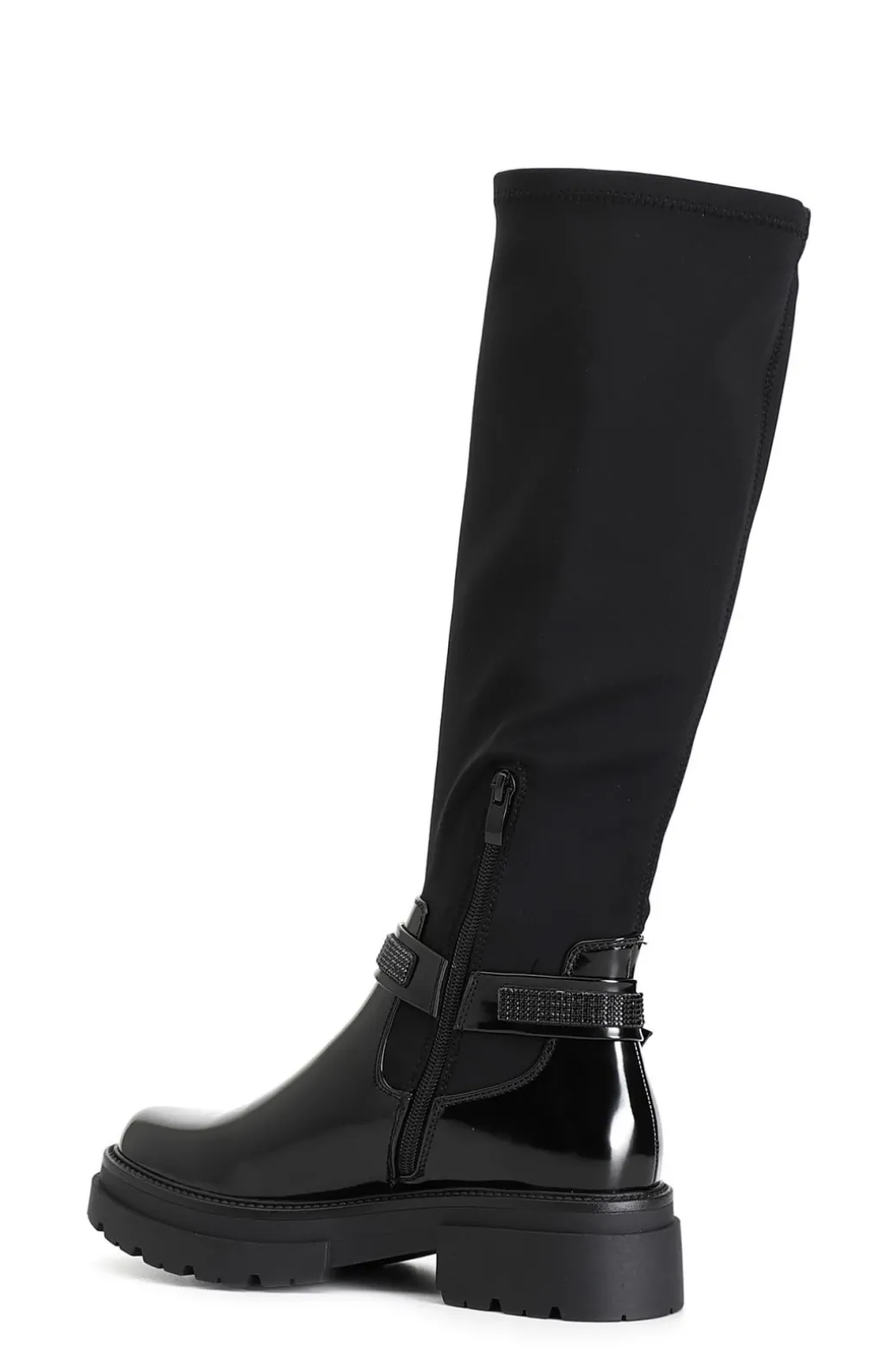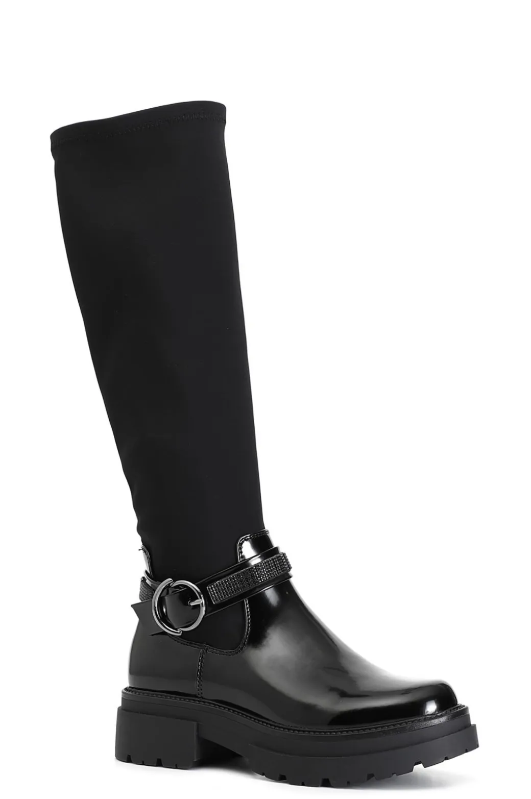 Stivale da donna in similpelle spazzolata con gambale elasticizzato e cavigliera removibile arricchita da strass e fibbia. il soletto in è pelle.