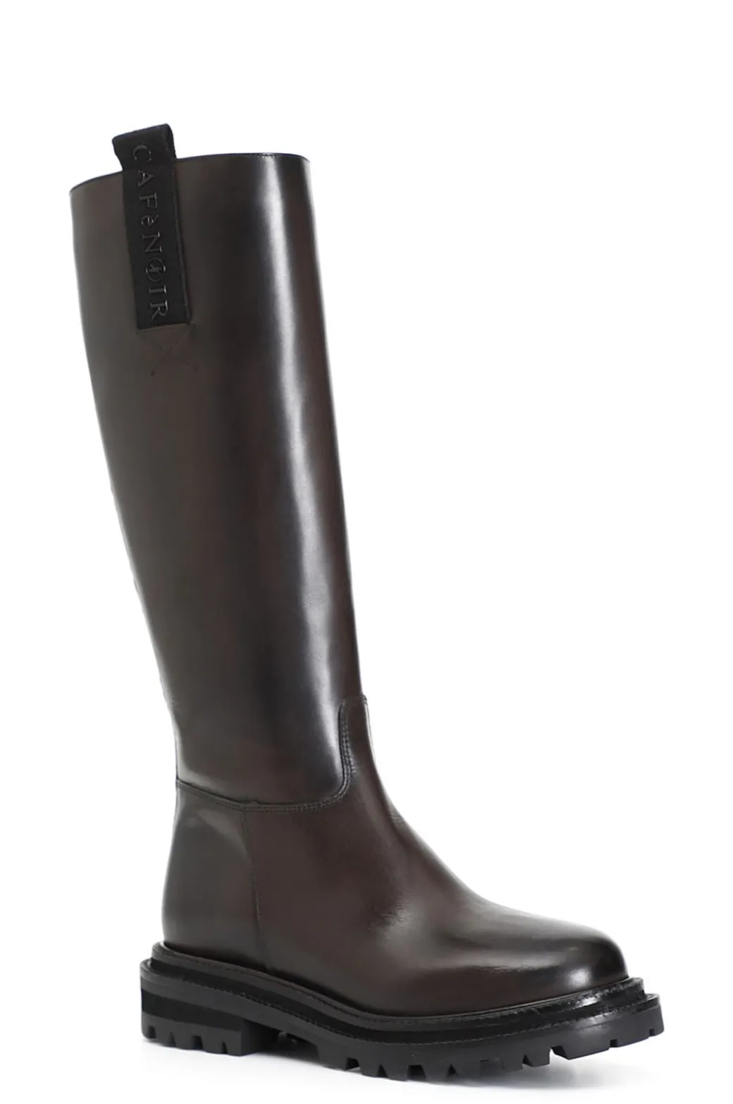 Stivale da donna in pelle con cerniera arricchito da un particolare nastro nero logato cafènoir. il soletto è in pelle.