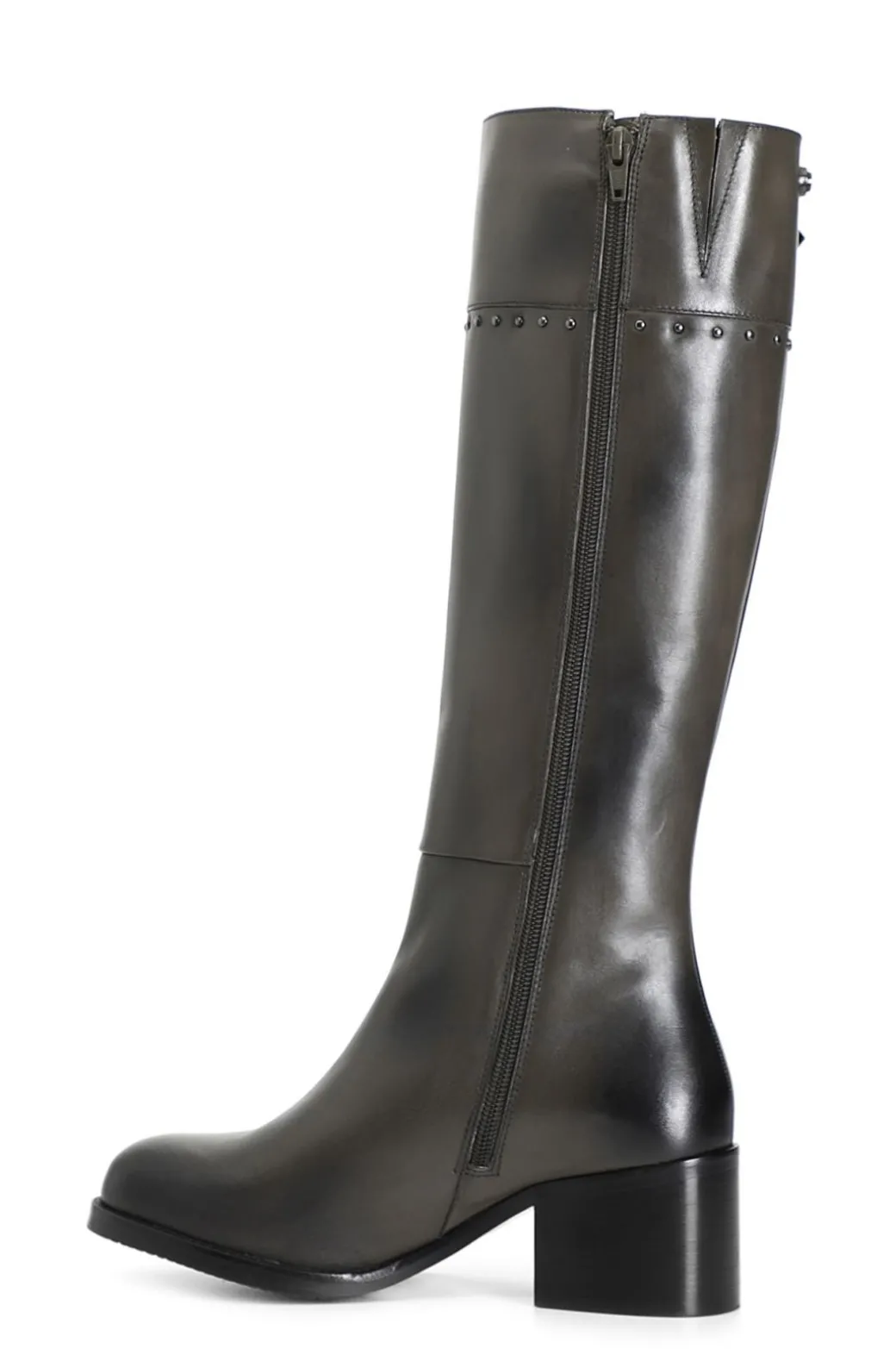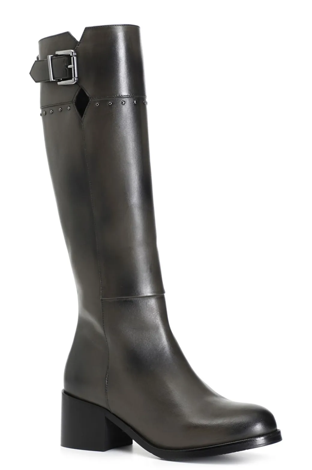 Stivale donna in pelle arricchito da una fibbia a decoro e da un motivo di borchie sul gambale. il tacco è alto 50mm. il soletto è in pelle.