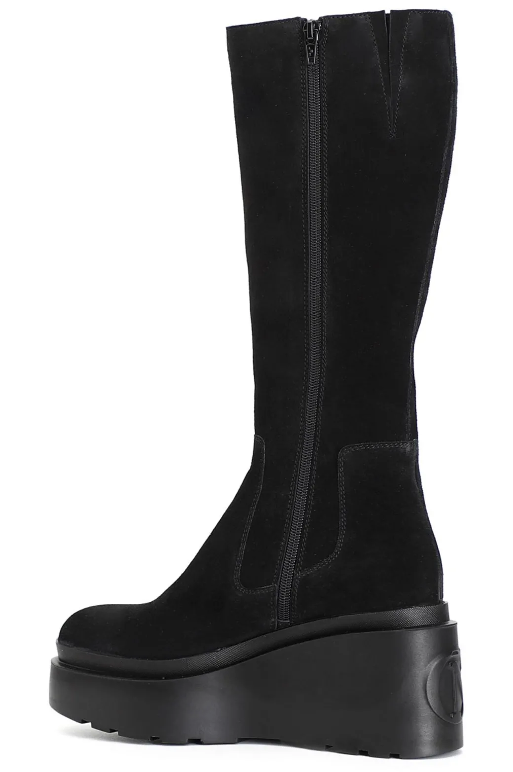 Stivale in pelle scamosciata con pleteau e tacco. soletto in pelle e suola con zeppa personalizzata con logo a rilievo sul retro.