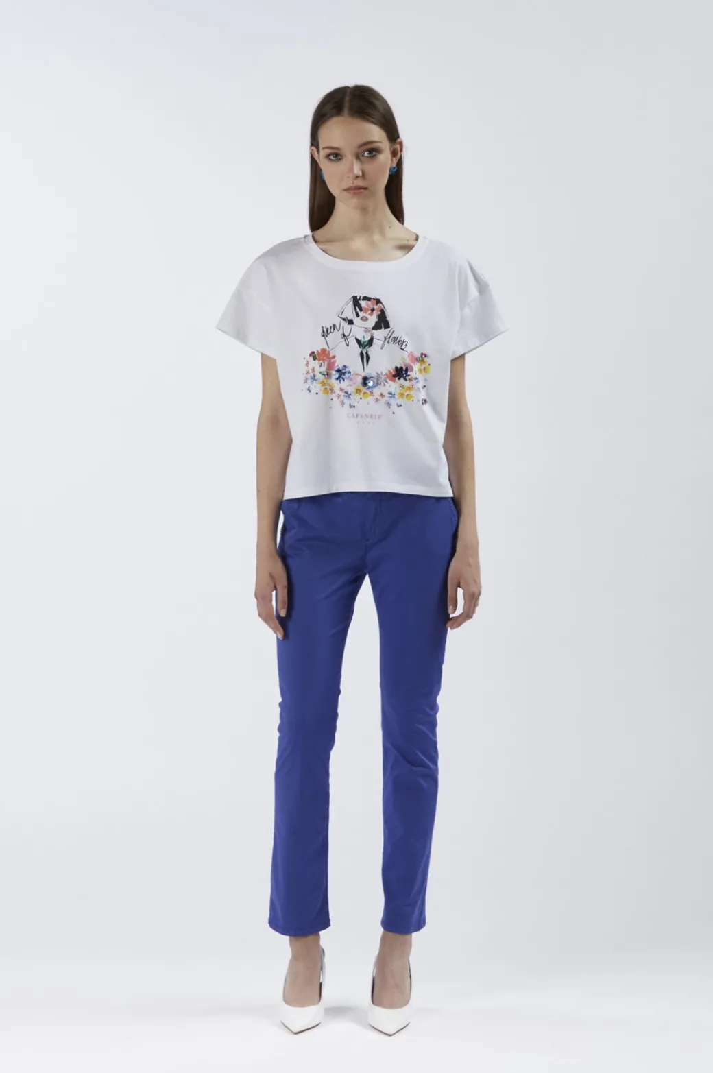 T-shirt a scatolina a maniche corte realizzata in jersey di cotone elasticizzato. elegante riproduzione di un volto femminile e dei fiori. la grafica è arricchita da strass incastonati ad elementi tridimensionali.