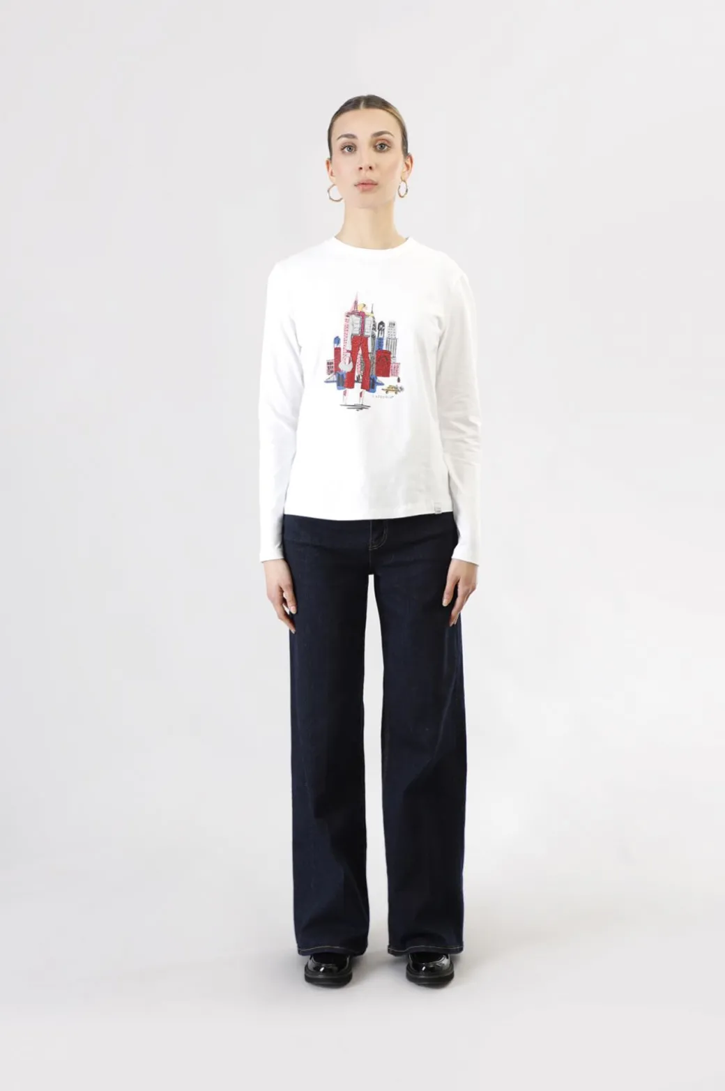 T-shirt dalla vestibilità regolare e con maniche lunghe realizzata in jersey di cotone elasticizzato. la stampa multitecnica riproduce una new york stilizzata.