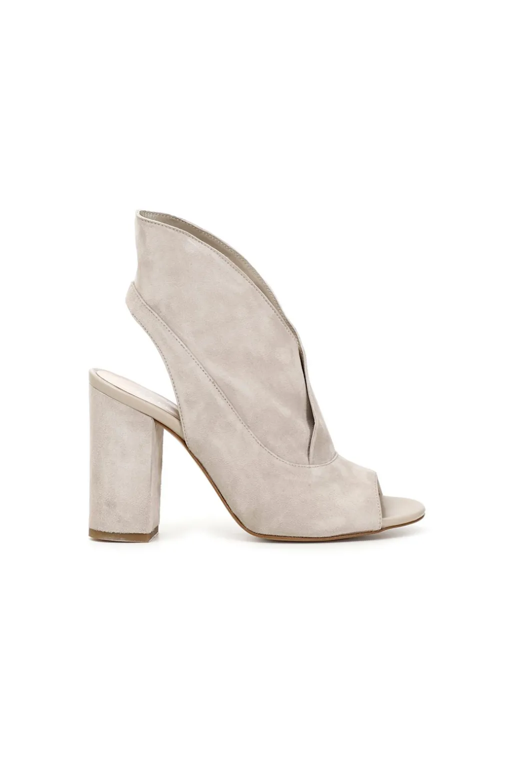 Tronchetti spuntati realizzati in pelle scamosciata con incrocio sul davanti e aperti dietro. Tacco fasciato in pelle.