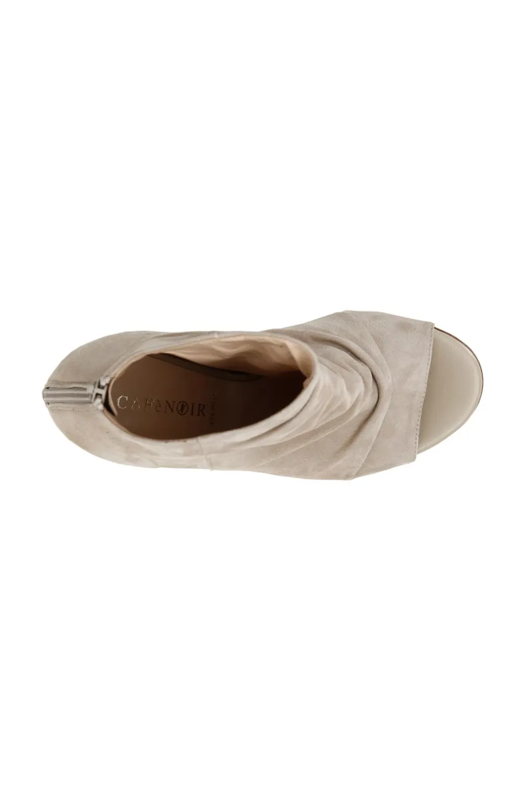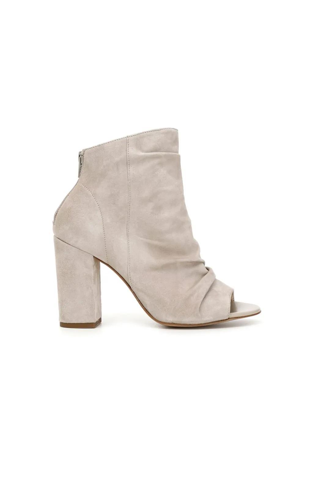 Tronchetti spuntati realizzati in pelle scamosciata. Tacco fasciato in pelle.