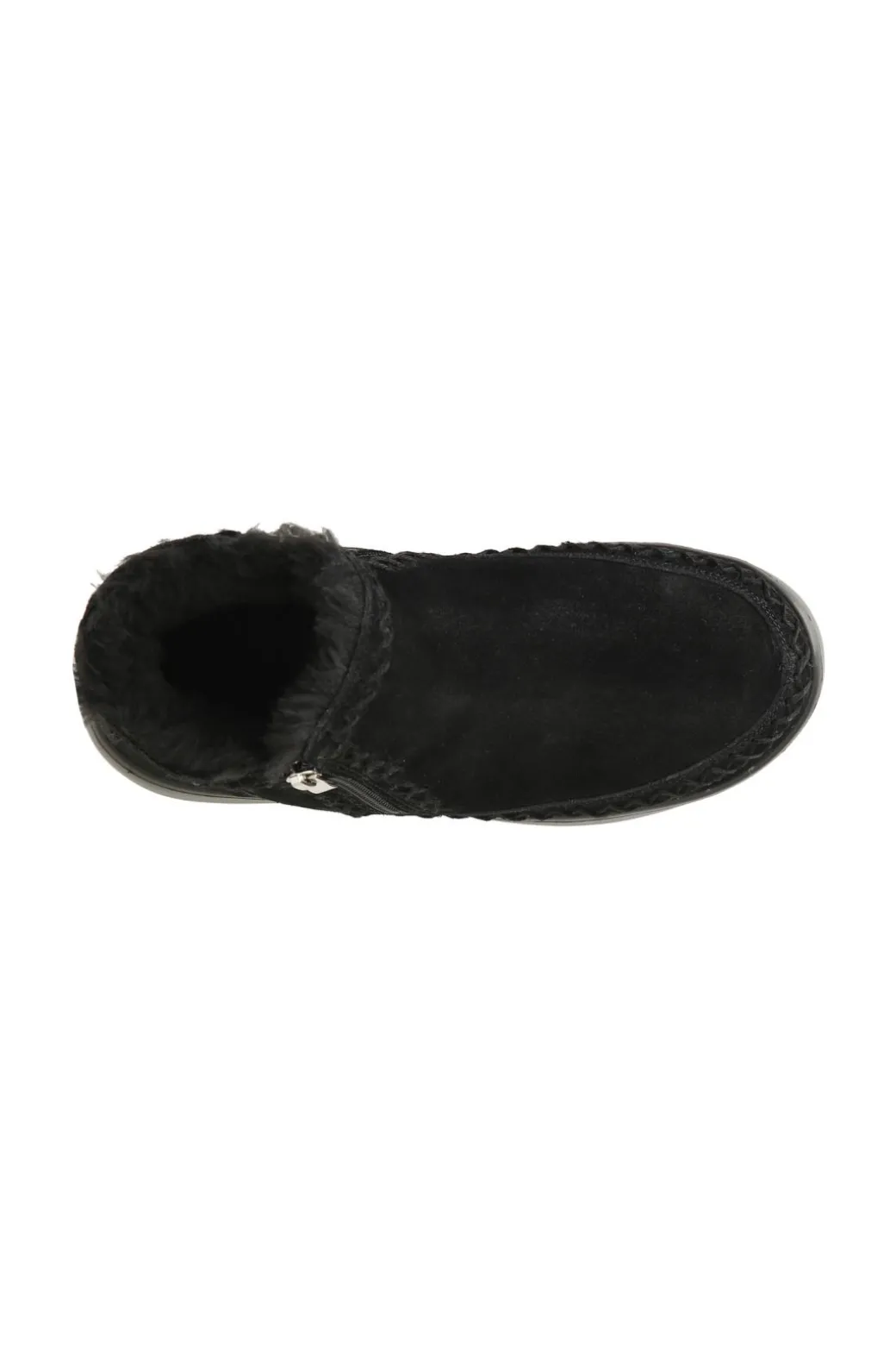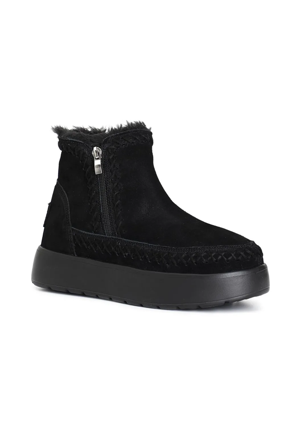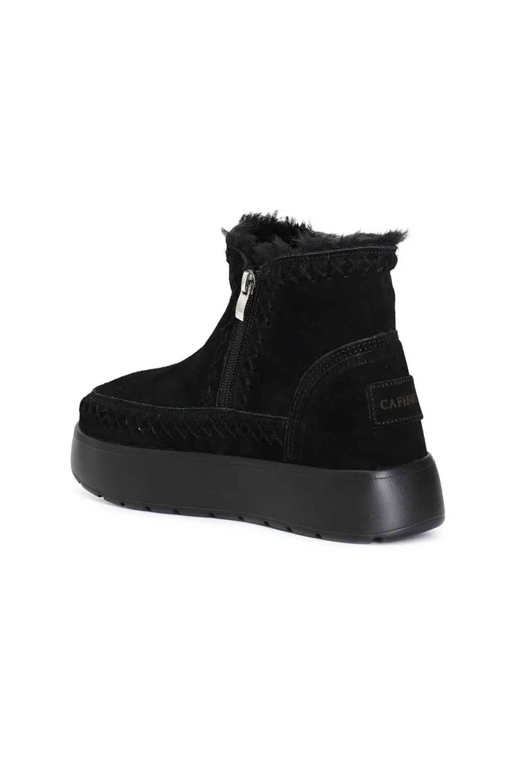 Tronchetto da donna con suola rialzata impunture e doppia cerniera. tomaia in pelle scamosciata e fodera in pelliccia sintetica.