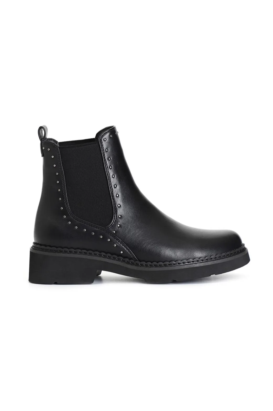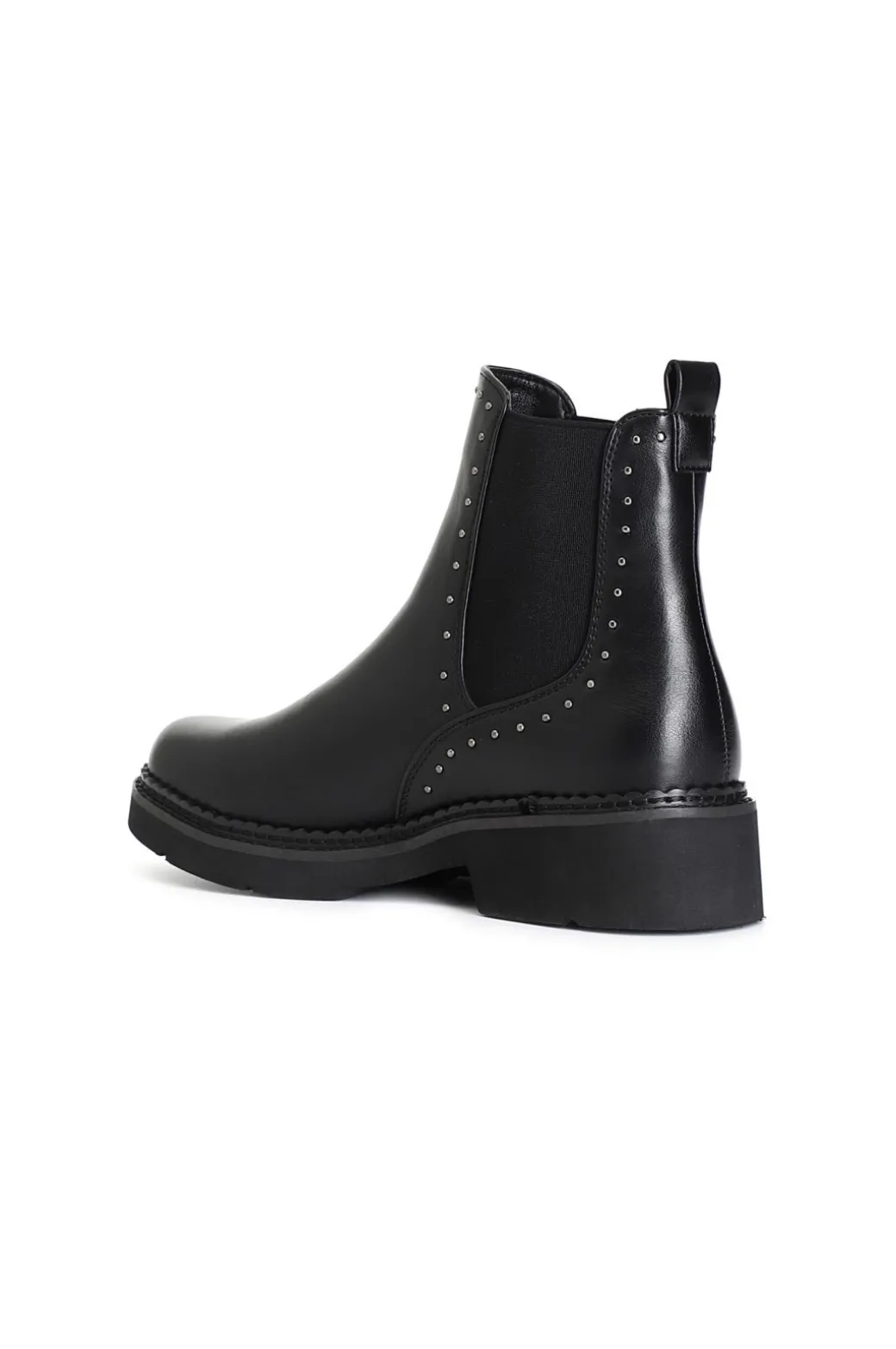 Tronchetto da donna in similpelle con elastici sulla parte laterale del gambale per agevolare la calzata. il tutto arricchito da microborchie cromate. il soletto è in pelle.