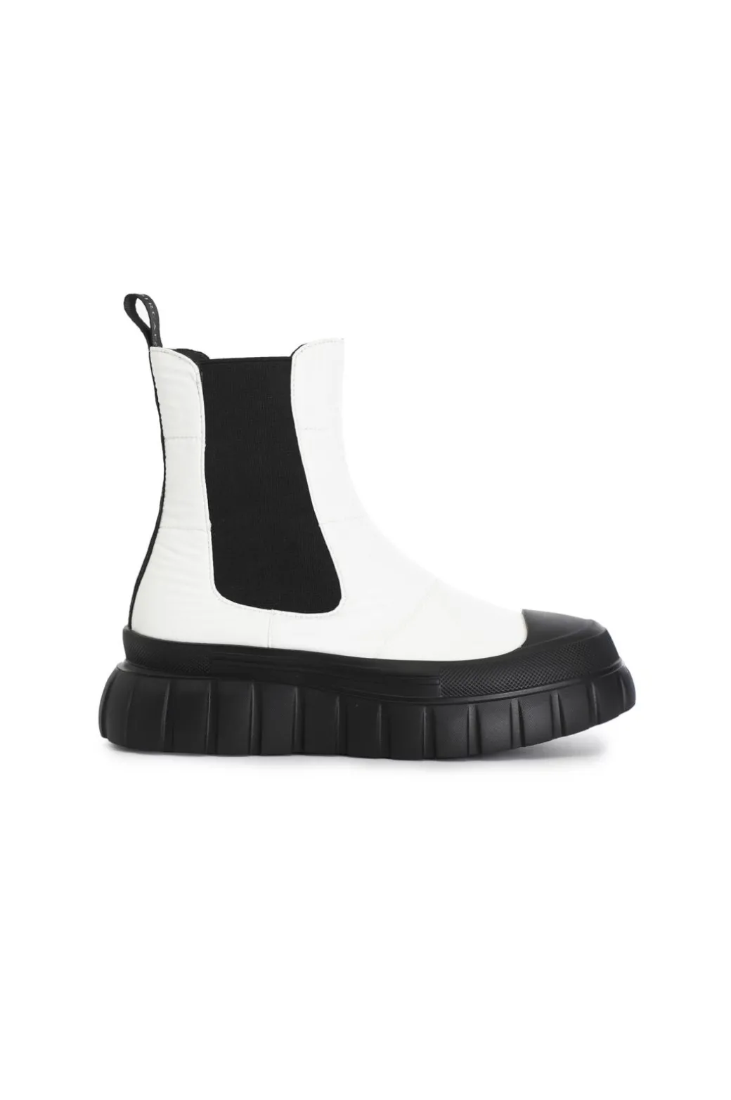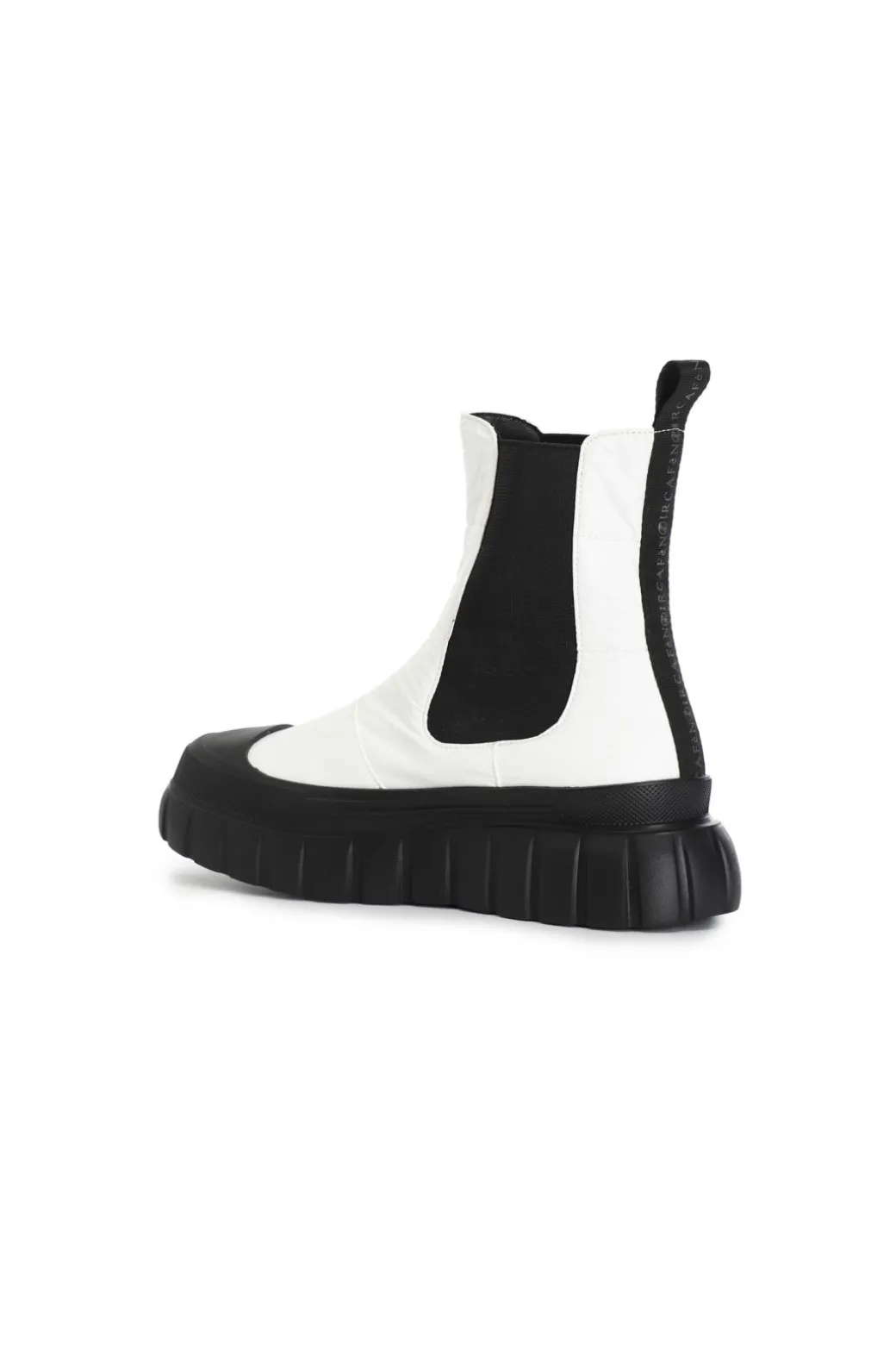 Tronchetto dallo stile sportivo con elastici sulla parte laterale della calzatura per agevolare la calzata. tomaia in tessuto laminato con imbottitura trapuntata. suola rialzata caratterizzata da un particolare motivo rigato.