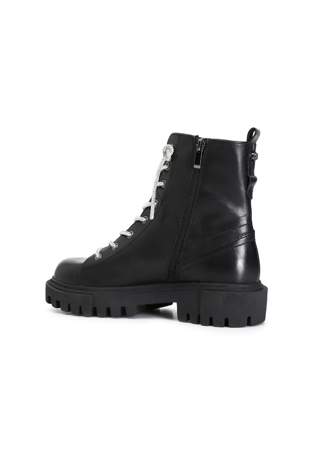 Tronchetto da donna in pelle con lacci fatti impreziositi da strass ultrabrillanti. il soletto è in pelle. la suola carro armato in materiale extralight slancia la modelleria e la rende iper attuale.