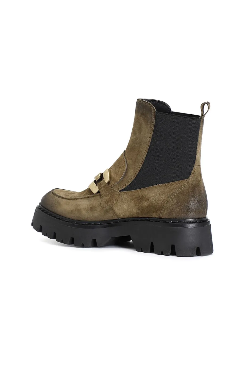 Tronchetto da donna in pelle scamosciata arricchito da un morsetto e con elastico laterale. il soletto è in pelle. modello versatile e dinamico ideale per completare moltissimi outfit.