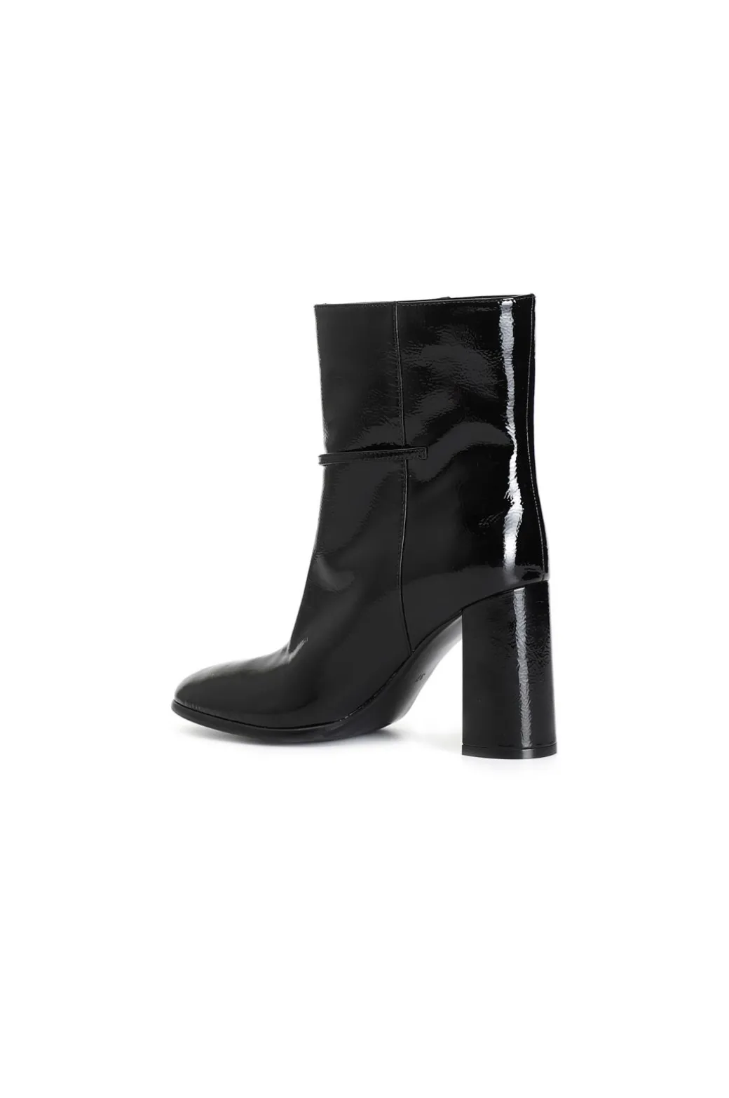 Tronchetto da donna in pelle verniciata con cinturino e accessorio personalizzato. tacco squadrato 88 mm. il soletto è in pelle. calzatura molto versatile e chic per interpretare con stile i look da ufficio e per il tempo libero.