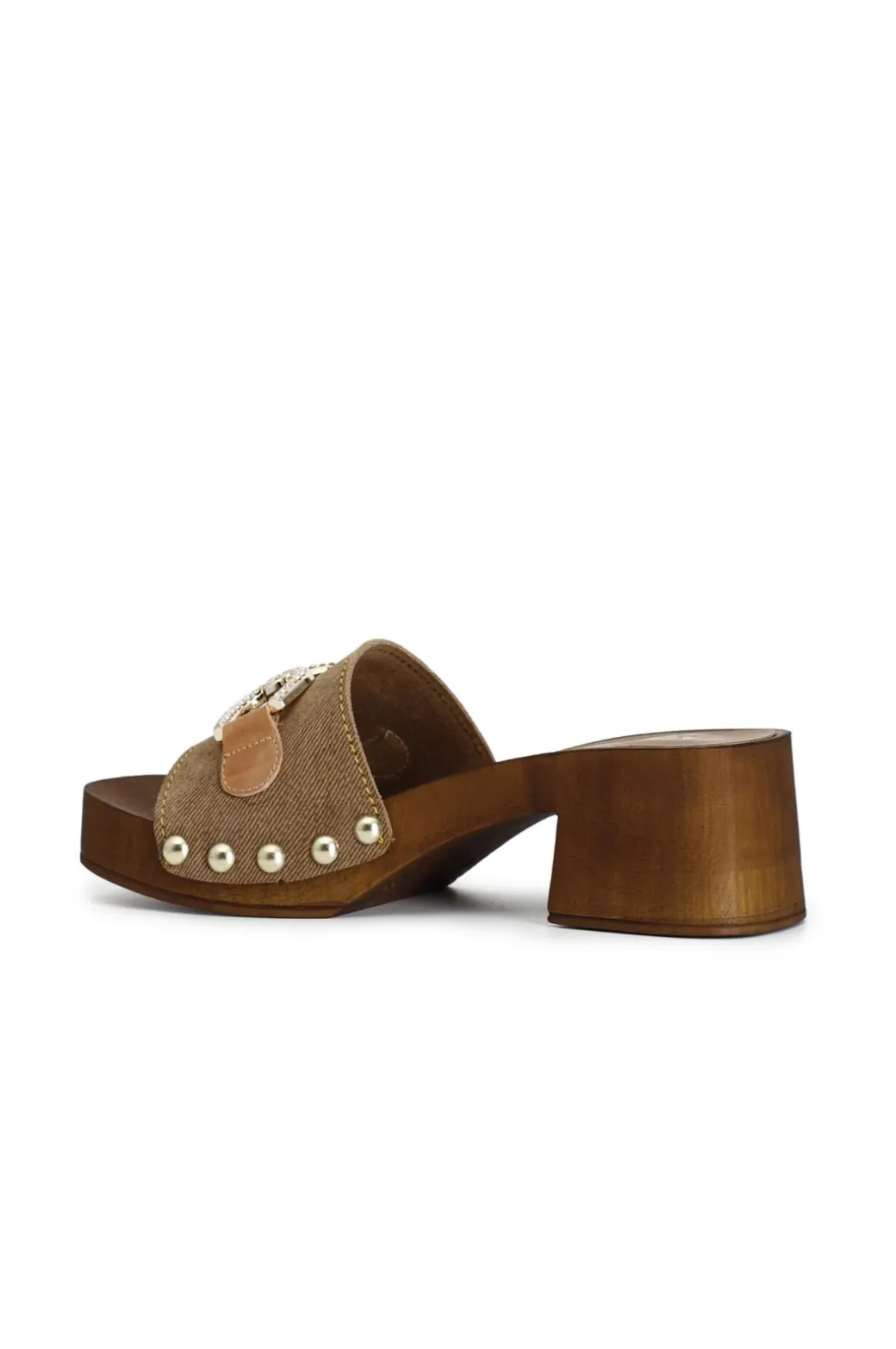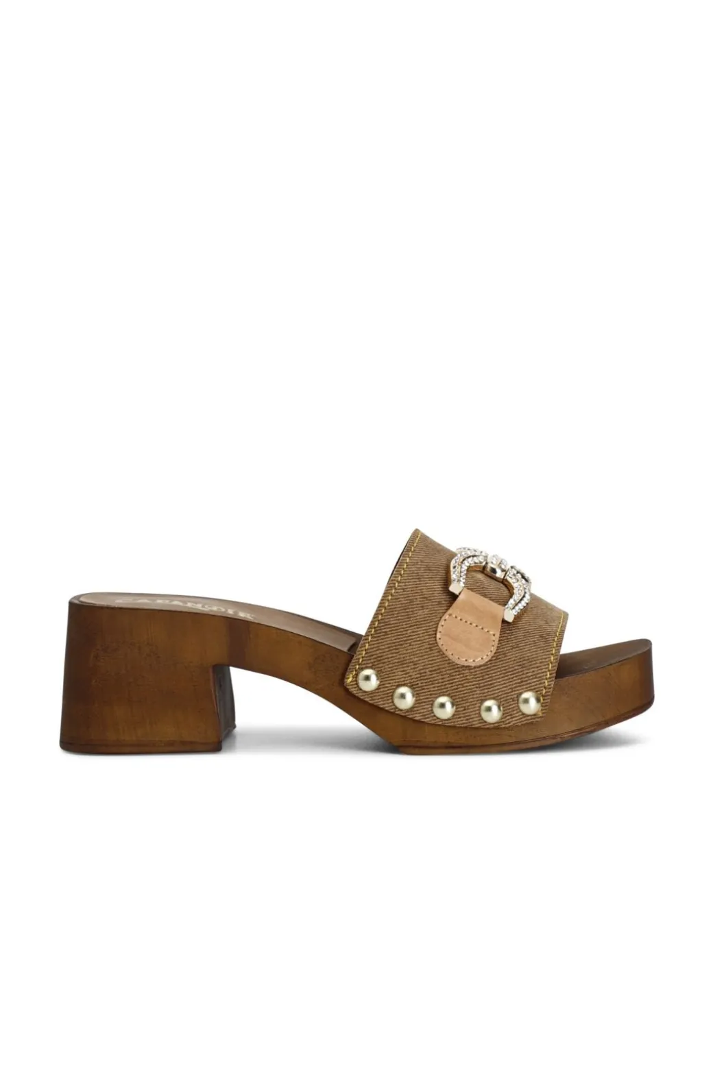 Zoccoli con tacco in legno in pelle scamosciata con morsetto. plateau alto 24mm e tacco 55mm.