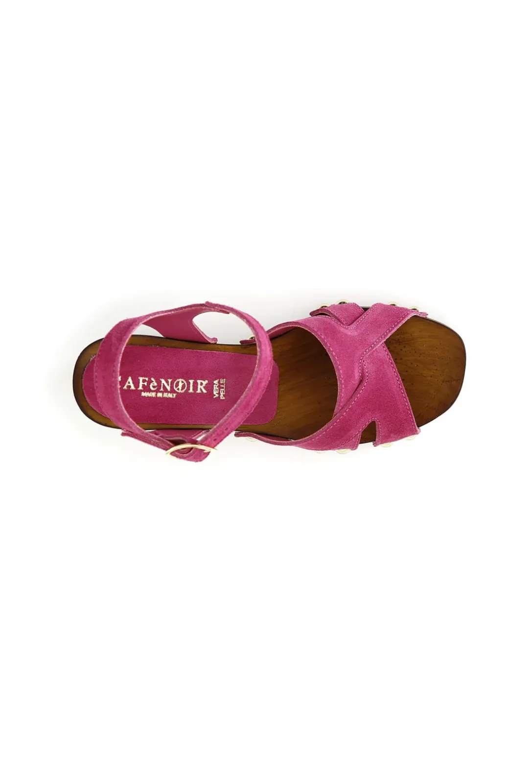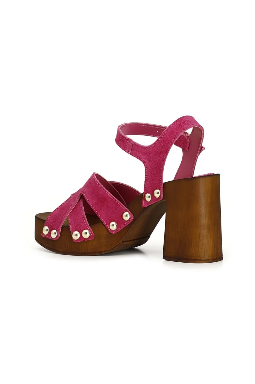 Zoccoli con tacco alto in legno e plateau. intreccio in suede e cinturino alla caviglia