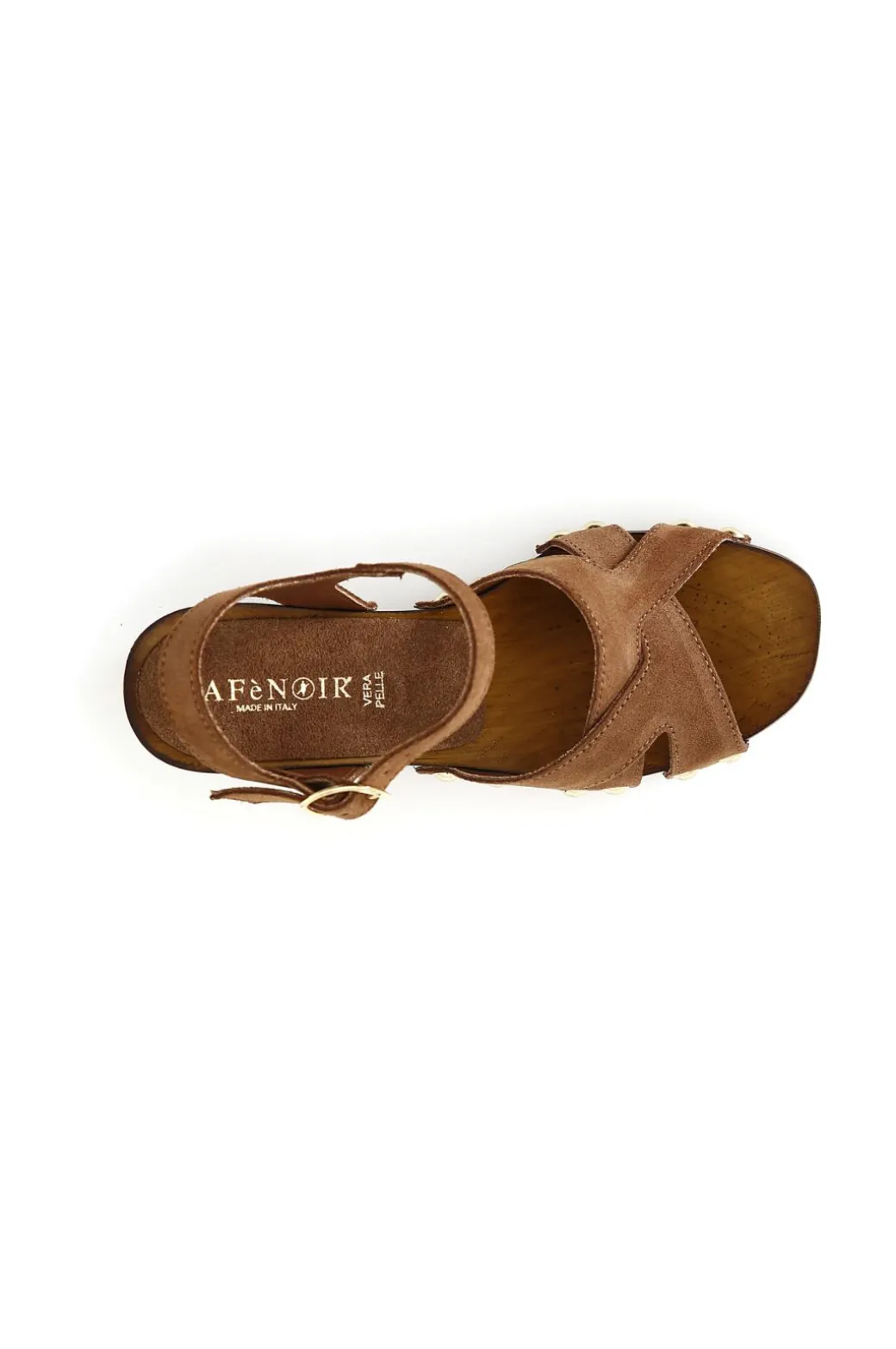 Zoccoli con tacco alto in legno e plateau. intreccio in suede e cinturino alla caviglia