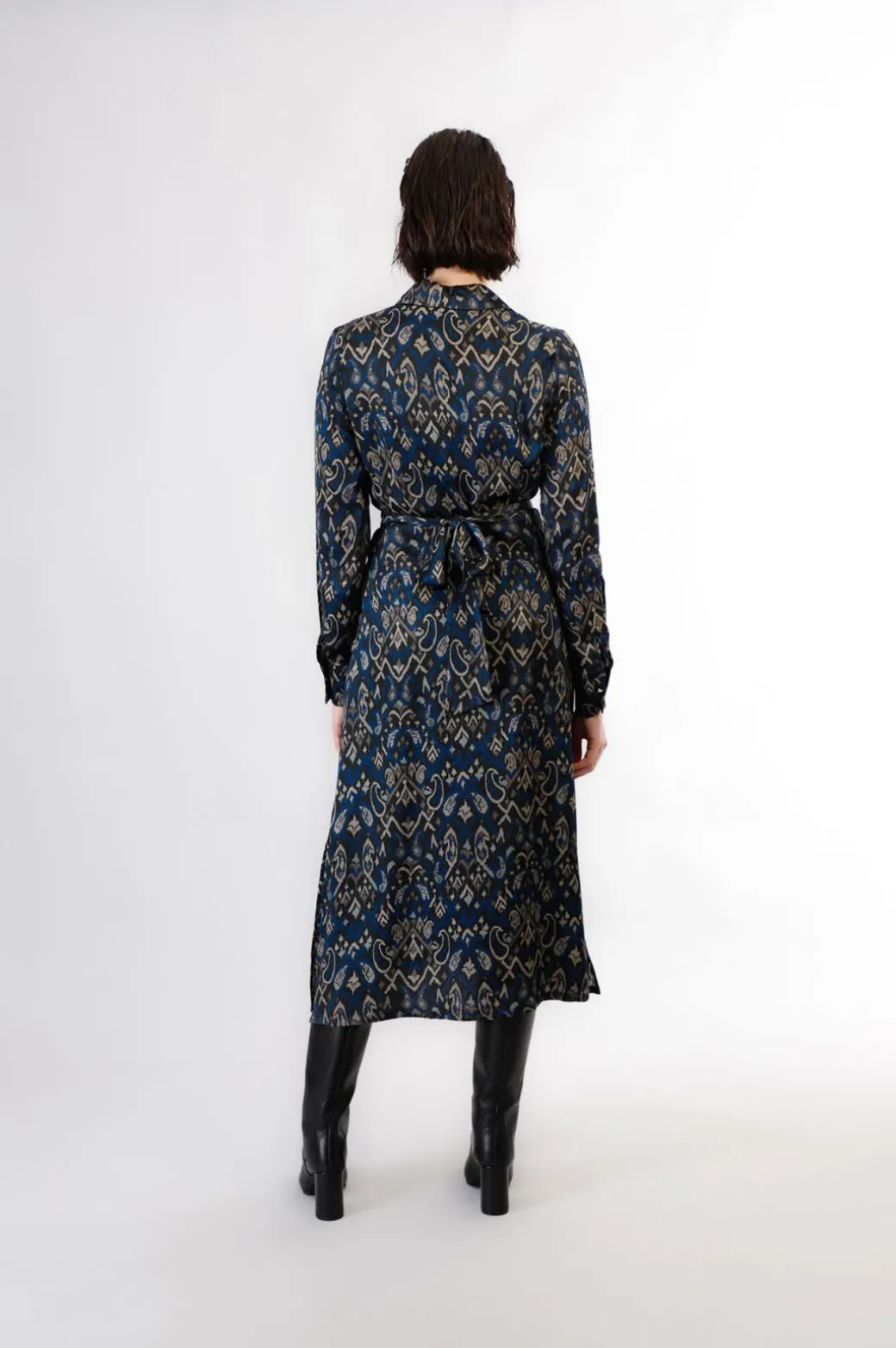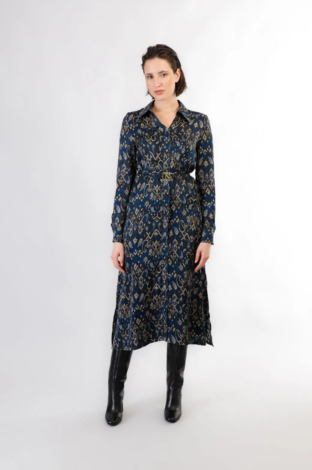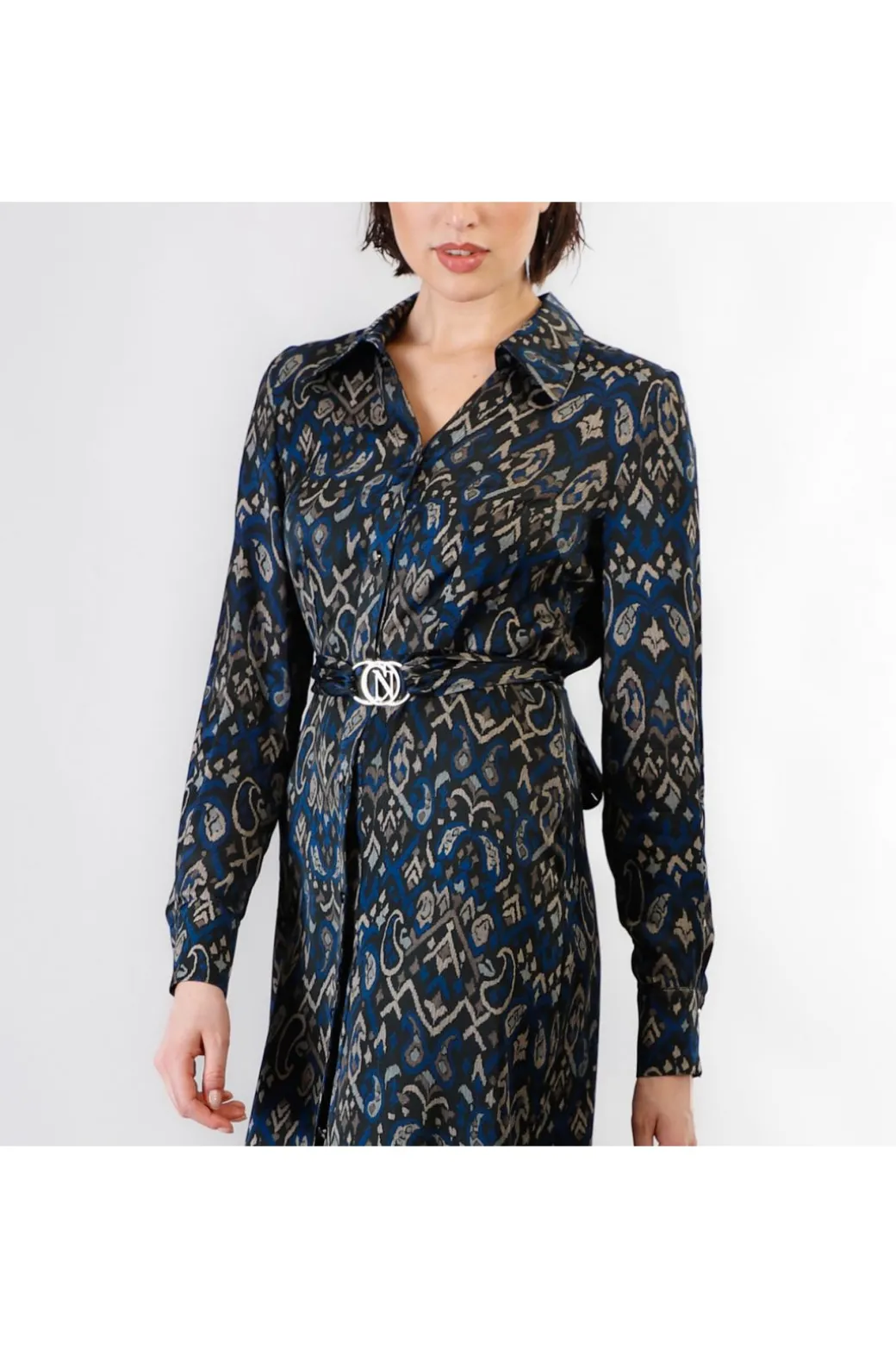 Abito modello chemisier in viscosa stampata. il capo è a maniche lunghe e spacchi laterali. chiusura frontale con bottoni a vista. la sua vestibilità morbida non segna la silhouette. delineato il punto vita grazie alla fusciacca in tessuto con fibbia logata cafènoir.