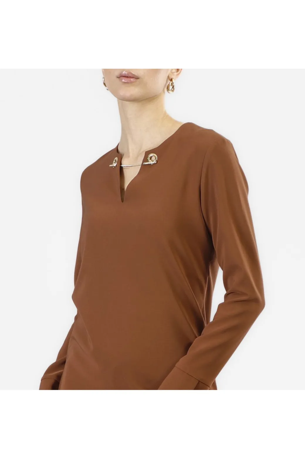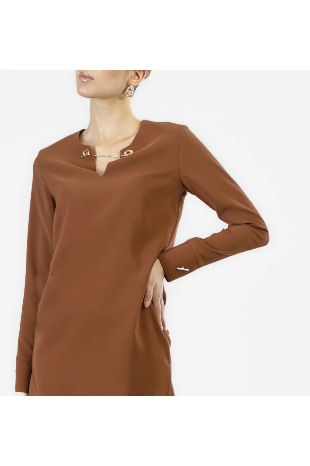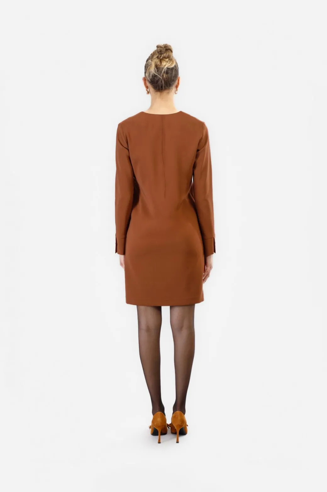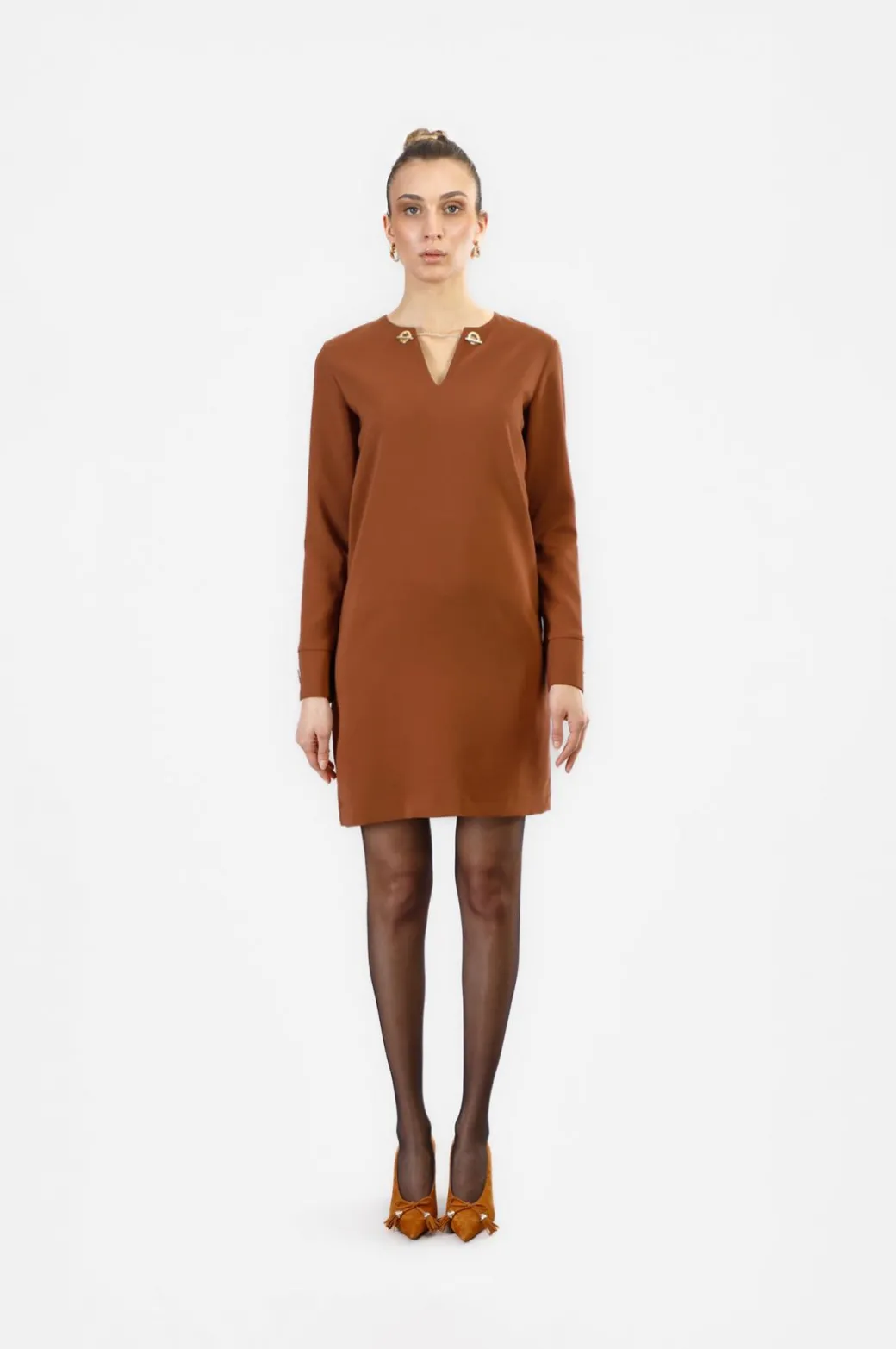 abito dritto con scollo a "v" in tessuto bistretch tabacco