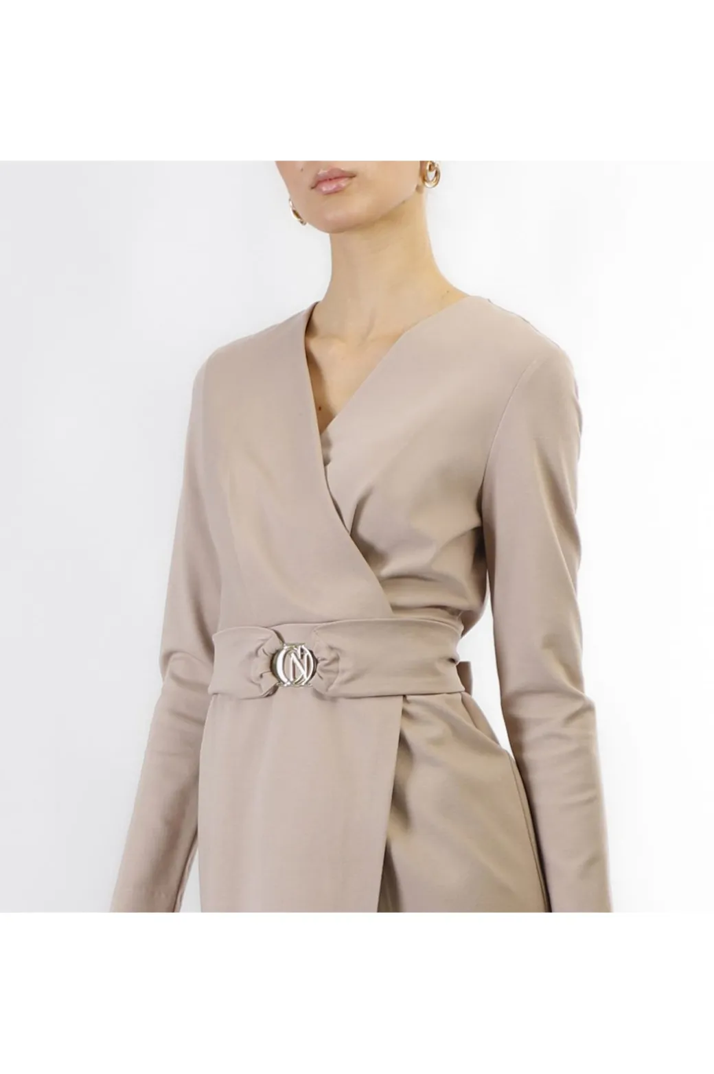 Abito portafoglio realizzato in tessuto elasticizzato punto milano. abito a maniche lunghe con scollatura incrociata. il capo è completo di una fusciacca in tessuto con fibbia logata cafènoir. chiusura con zip invisibile sul retro. capo giornaliero e versatile per diverse occasioni d’uso.