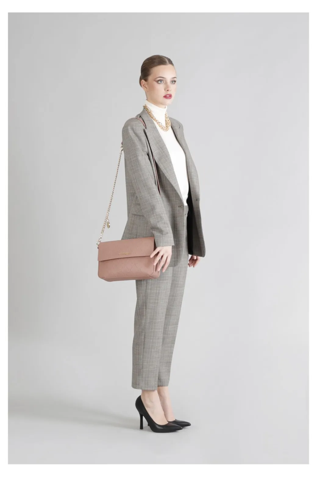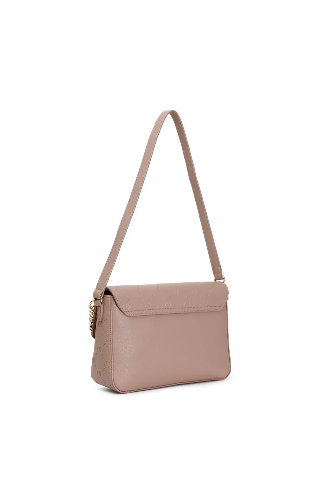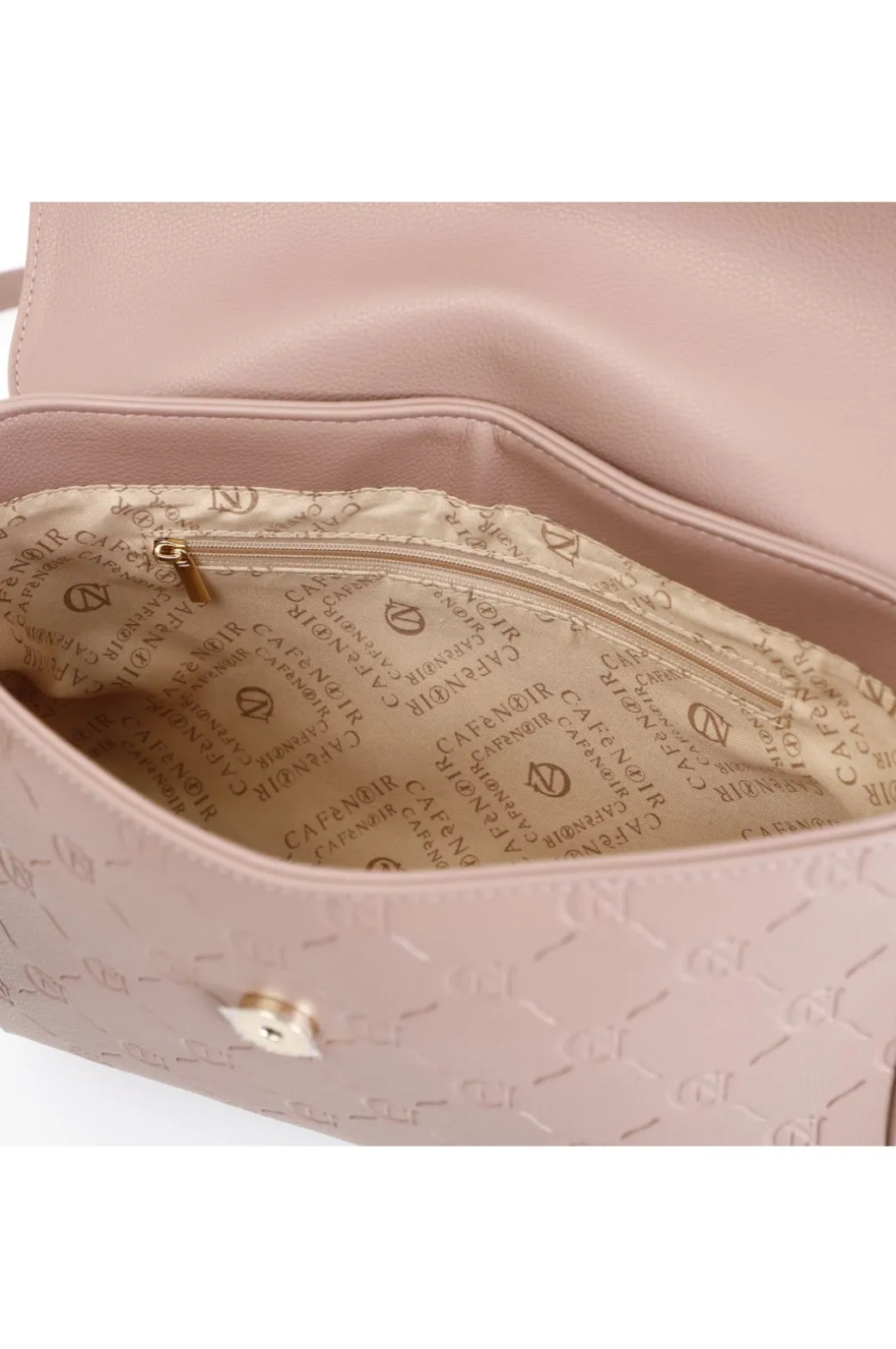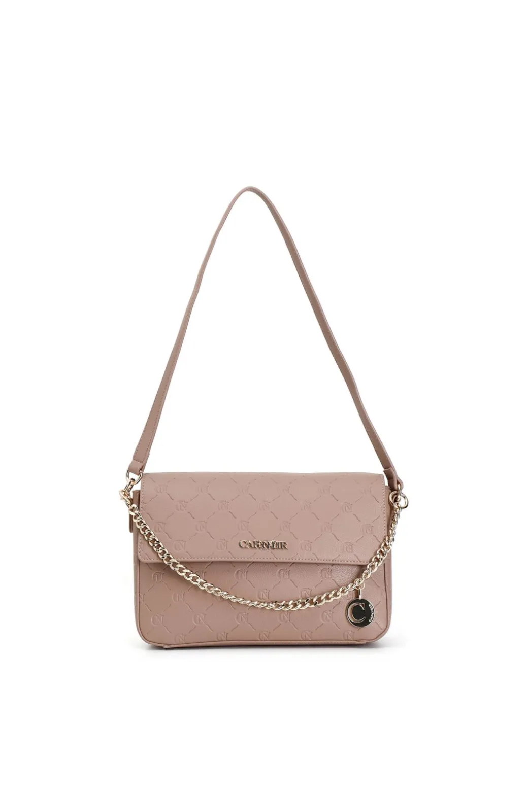 Bandoliera con logo embossed all-over. doppio scomparto e doppia cerniera. taschino frontale con zip. catena decorativa dorata con placchetta removibile.