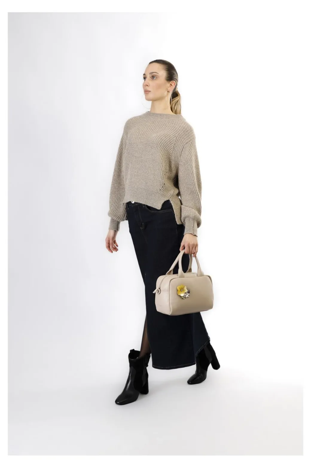 Bauletto a mano in materiale sintetico liscio imbottito effetto puffy con applicazione di fiori in paillettes. borsa provvista di unico scomparto di un taschino interno con zip. chiusura con cerniera. borsa dotata di tracolla.