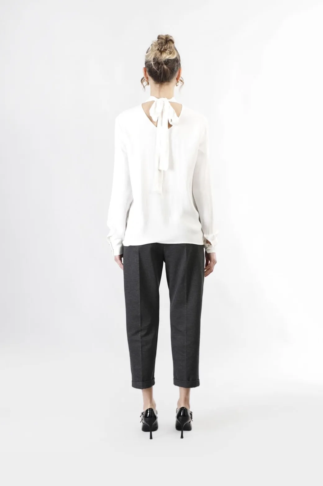 Blusa girocollo a maniche lunghe con motivo di pieghe sul davanti. fusciacca al collo con nodo sul retro. realizzata in georgette di viscosa. da abbinare ad un denim e indossare con un blazer per creare dei look casual e più ricercato.