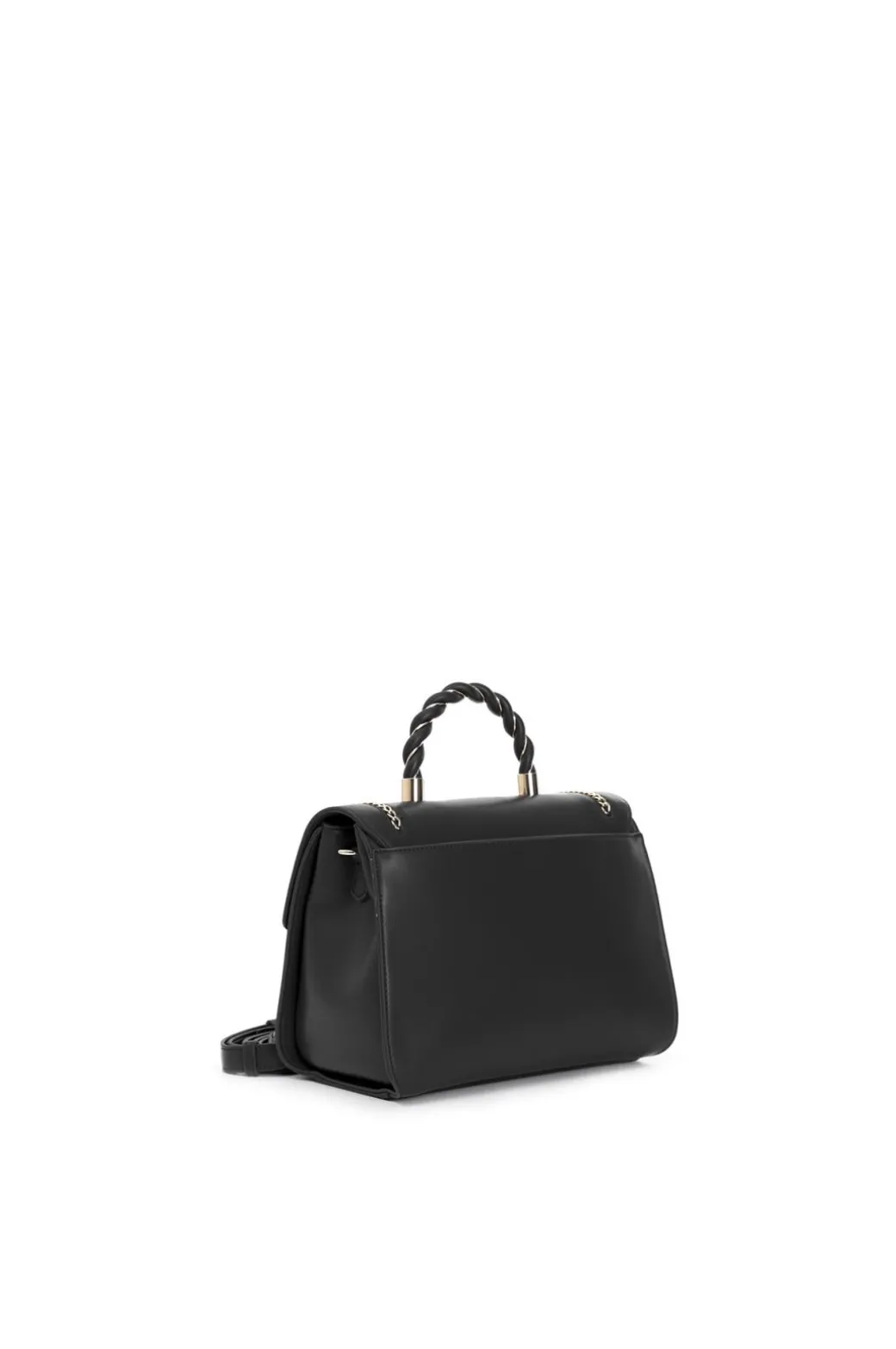 Borsa a mano con applicazione di catena in metallo dorato e logo cafènoir. manico in metallo con tubo. chiusura con calamita. tracolla removibile.
