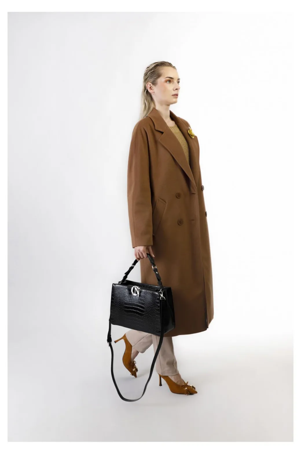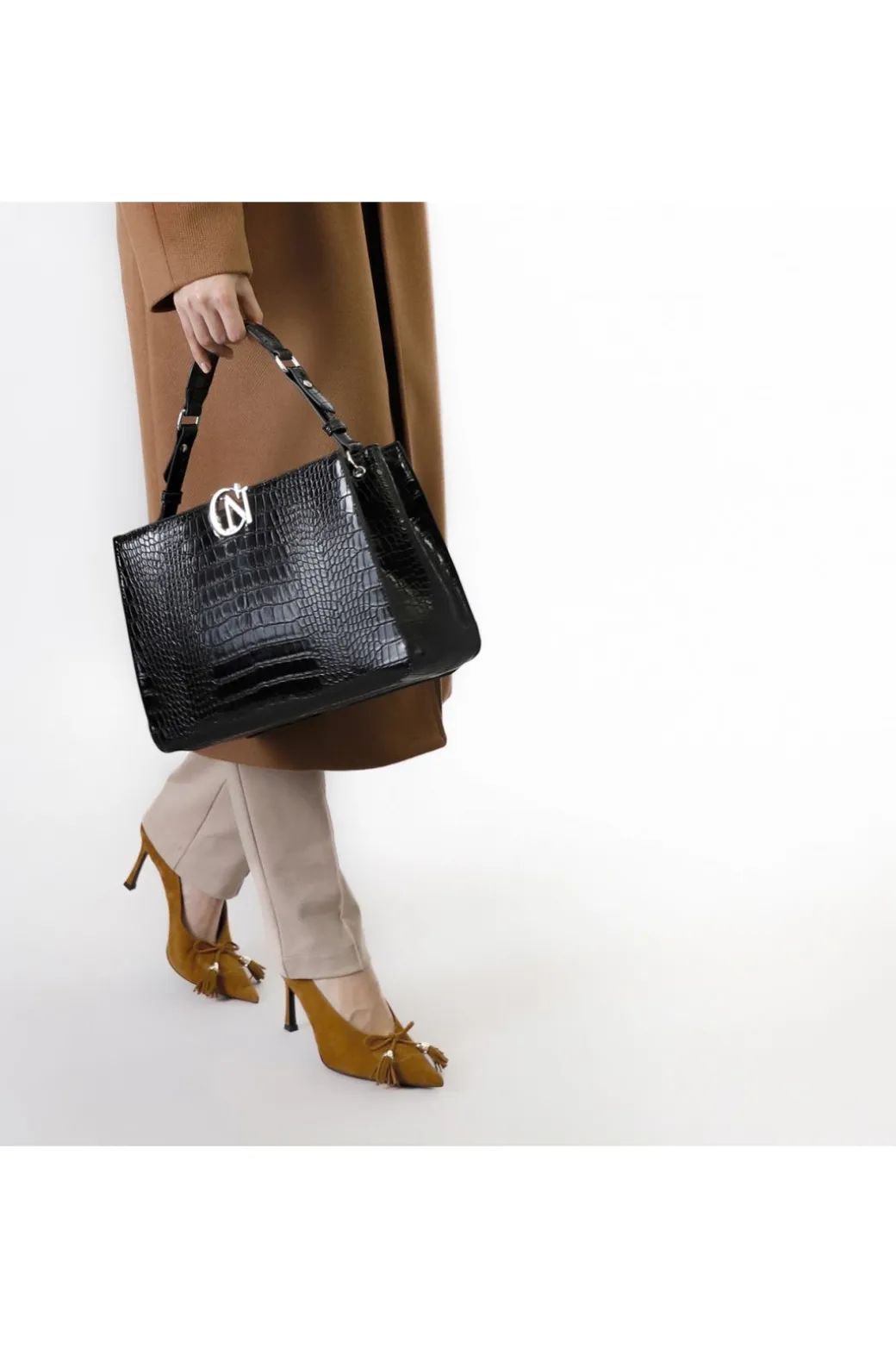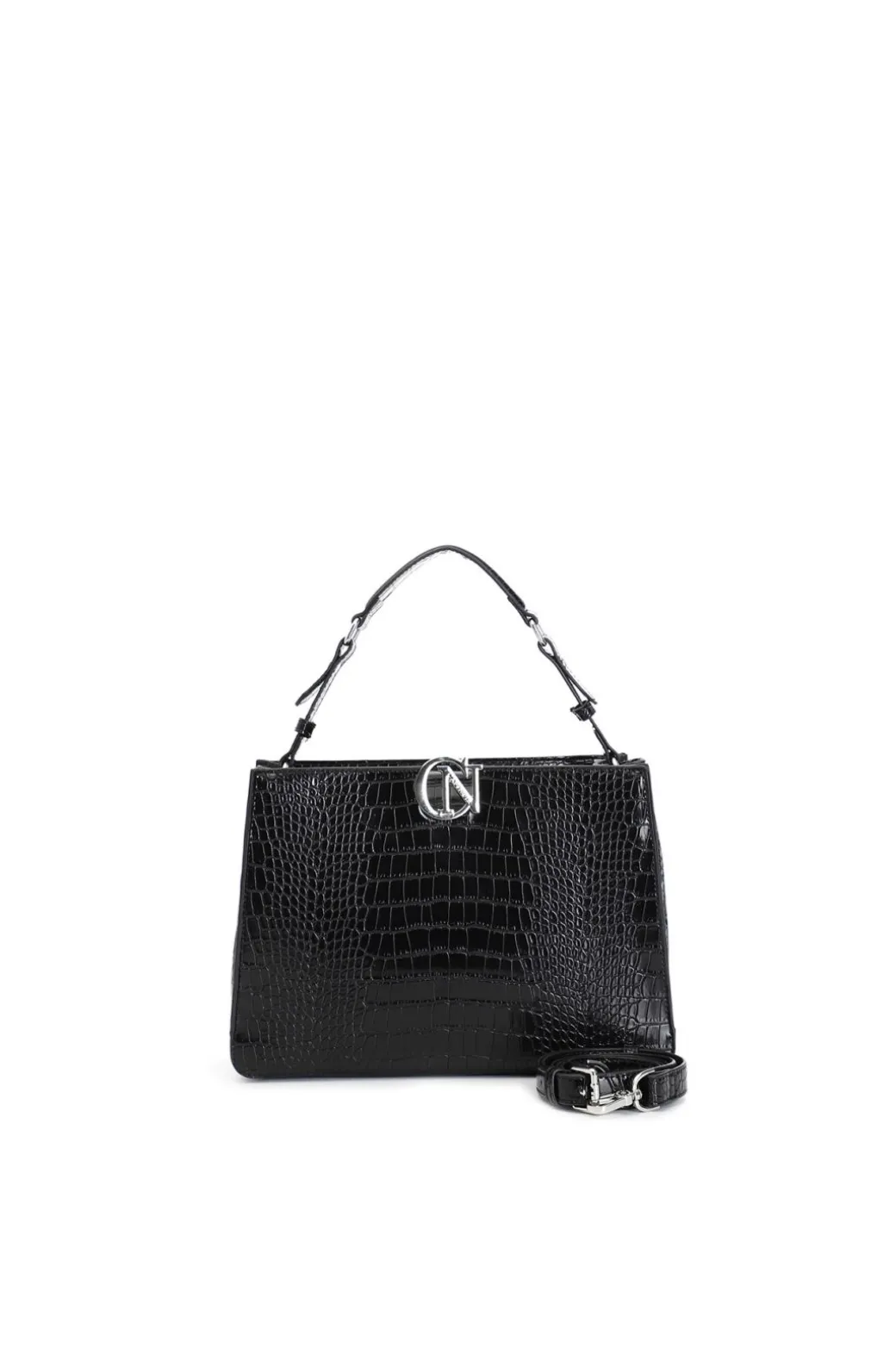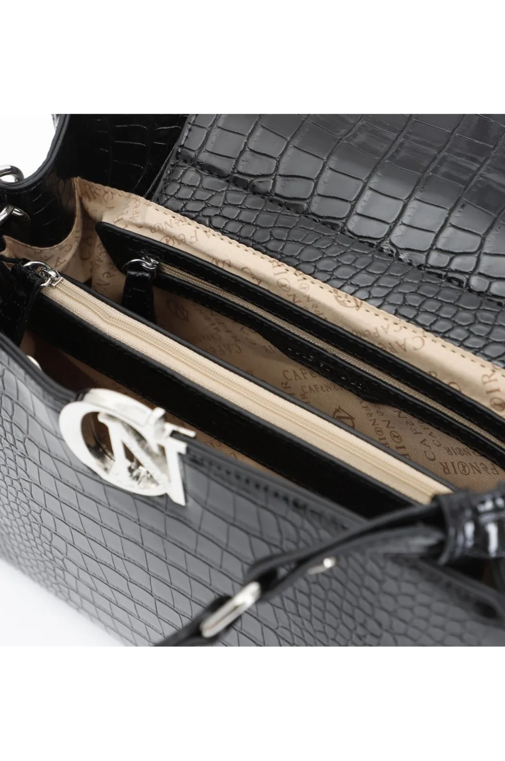 Borsa a mano rigido realizzata con stampa coccodrillo. logo cafènoir in metallo. tracolla removibile per un look da giorno più sofisticato