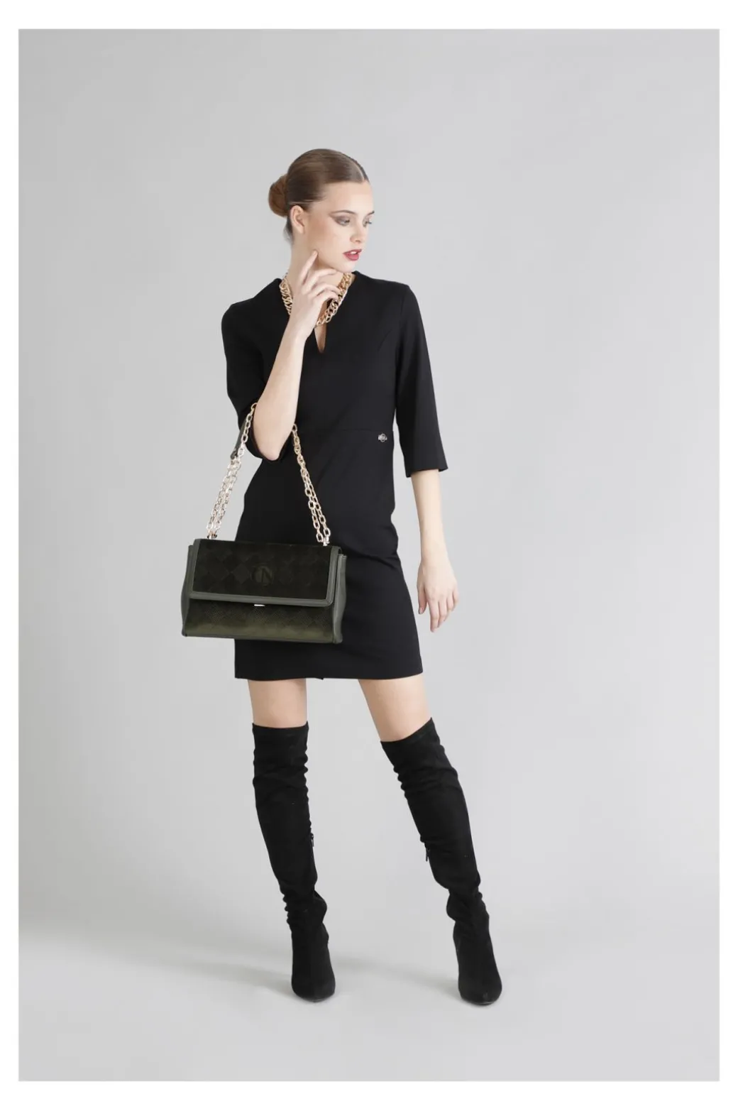 Borsa con pattina in velluto con logo embossed. doppio scomparto e taschino interno con zip. placchetta metallica con logo cafènoir sulla parte laterale. tracolla con catena scorrevole per portabilità a spalla.