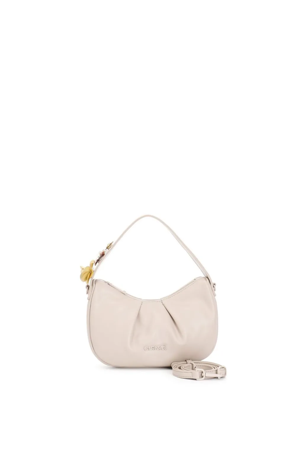 Hobo in materiale sintetico liscio imbottito effetto puffy con applicazione di fiori in paillettes. dotata di tracolla removibile chiusura superiore con zip e scomparto unico.