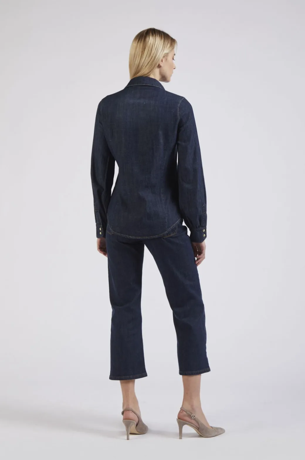 Camicia in tela denim leggera con maniche arricciate. placchetta personalizzata per rifinire il taschino.