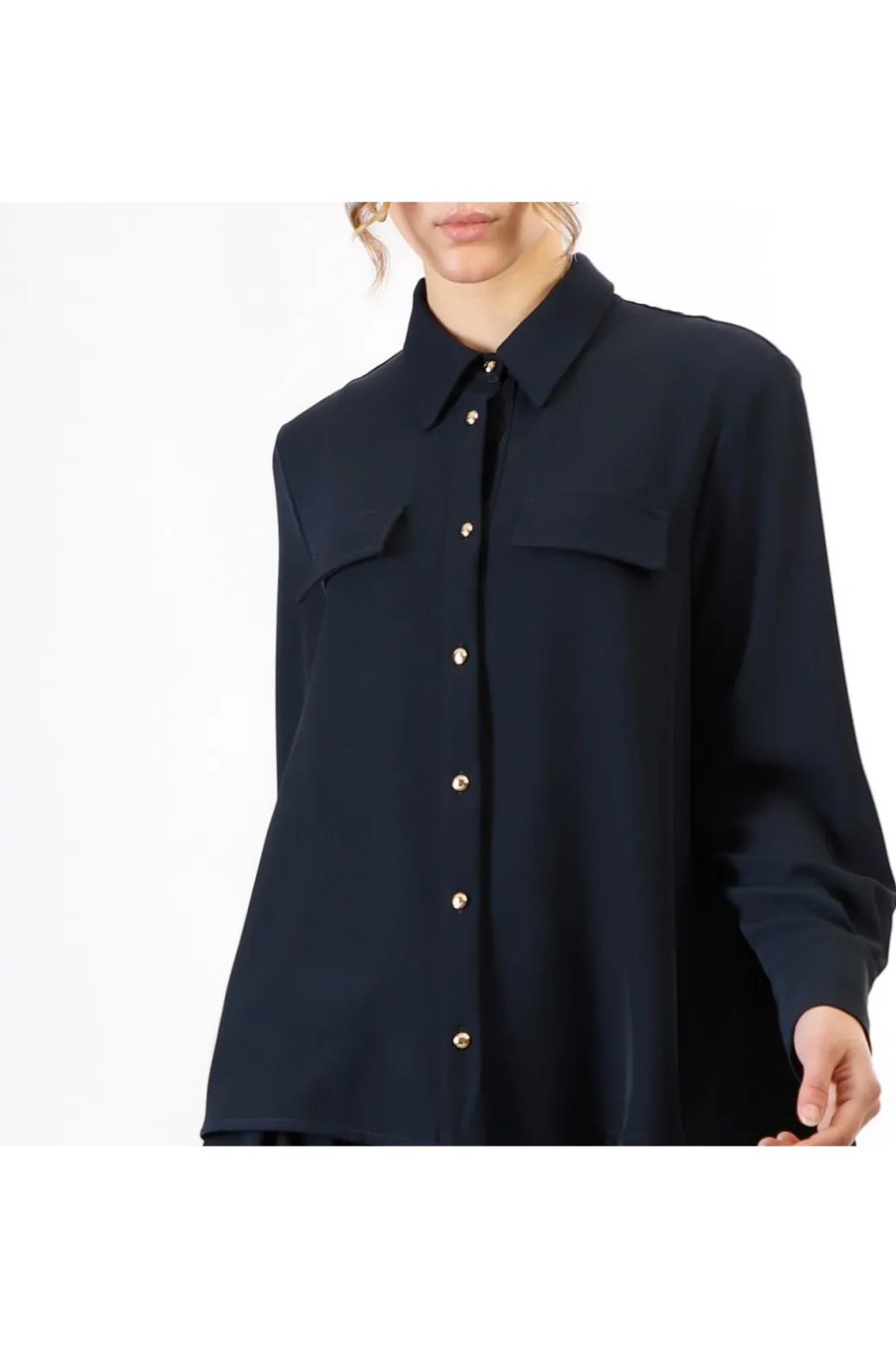 Camicia con taschini frontali realizzato in tessuto fluido chiusura con bottoni gioiello. camicia “di tutti i giorni” per eccellenza si abbina perfettamente a pantaloni e gonne cappotti e giacche rendendo il cambio look più facile che mai.