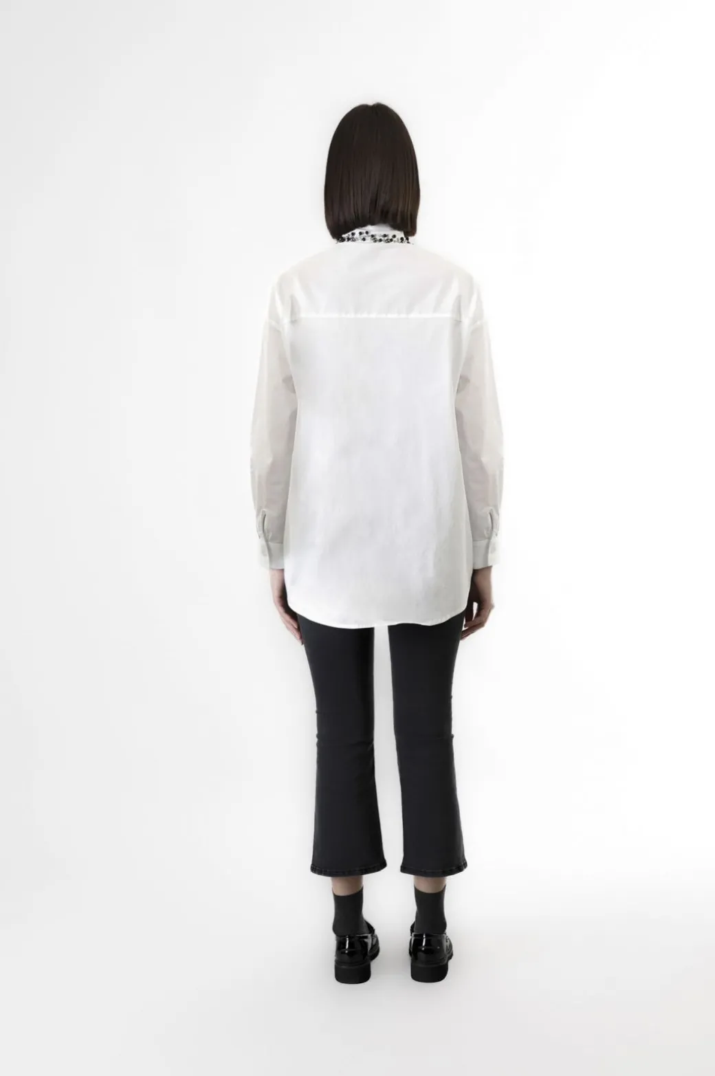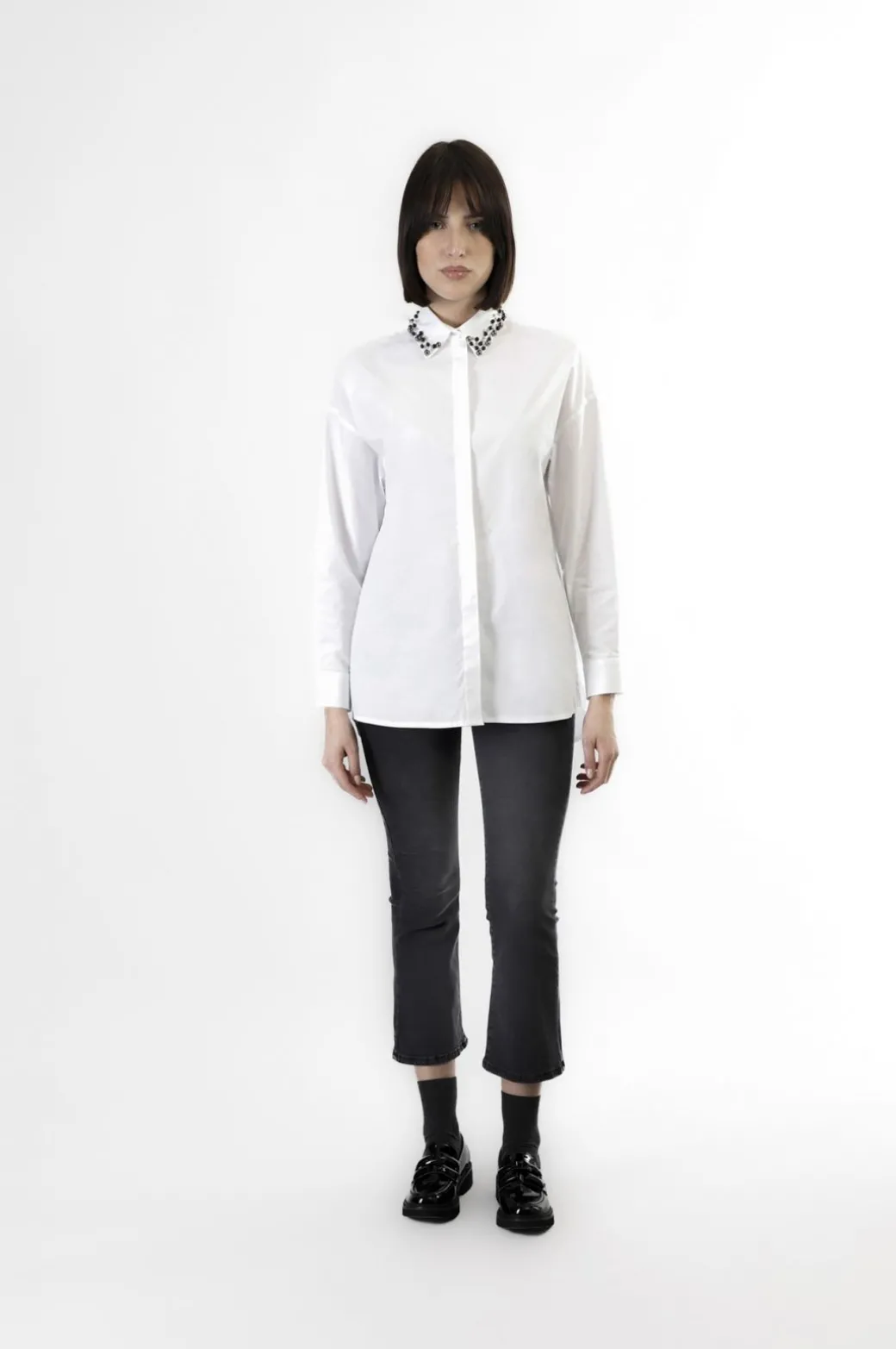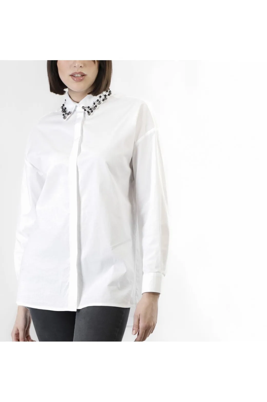 Camicia a maniche lunghe con il colletto ricamato a mano con perle brunite. il modello è realizzato in popeline di cotone e si caratterizza per la vestibilità over con spalle scese per un fit ancora più comodo. chiusura con bottoni nascosti. da abbinare ad un denim e indossare con un blazer per creare dei look casual e più ricercato.