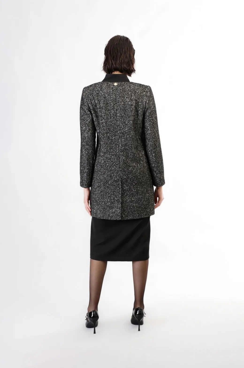 Cappotto dritto monopetto in tessuto spigato. chiusura con bottoni. capo elegante e funzionale.