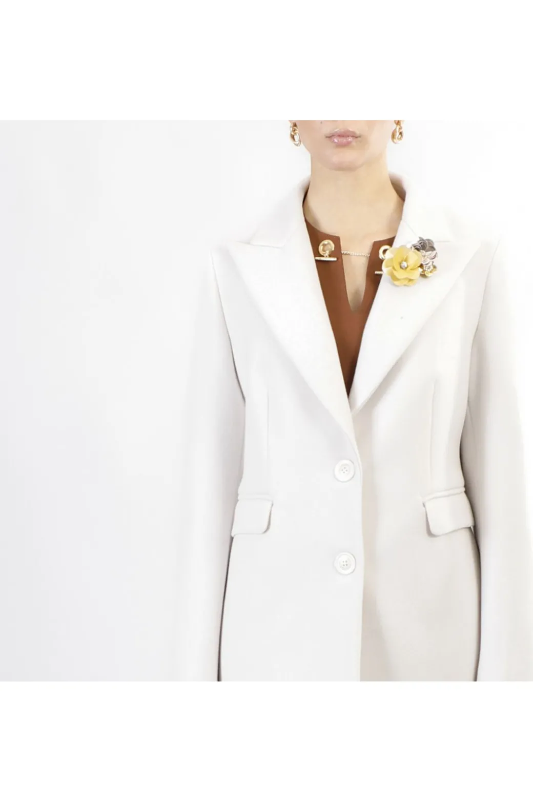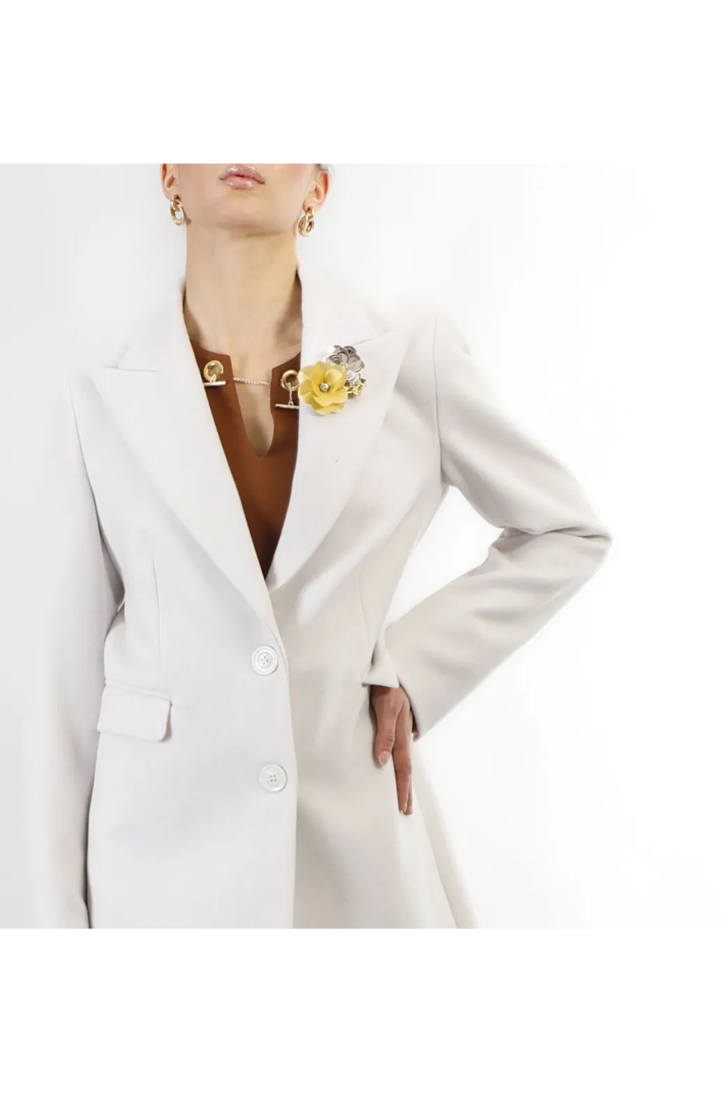 Intramontabile cappotto basico monopetto. il colletto è decorato da una spilla. perfetto per valorizzare in un attimo i look di tutti i giorni.