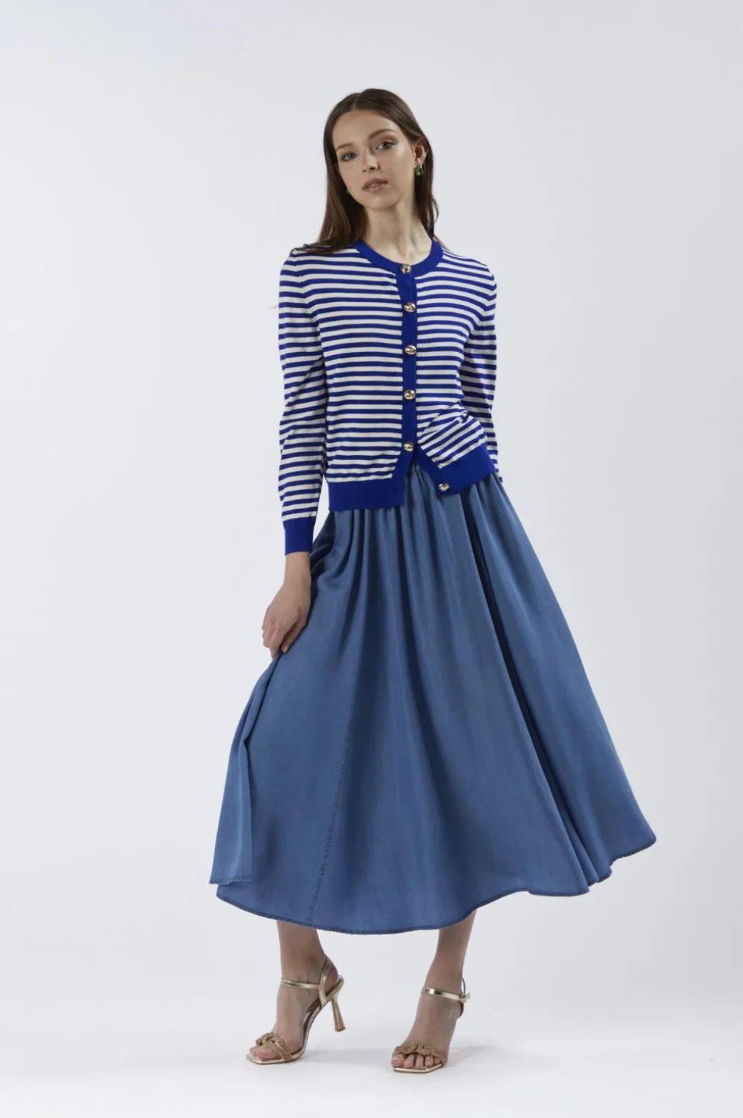 Cardigan girocollo a righe con maniche lunghe e bottoni dorati. realizzato in filato misto viscosa.